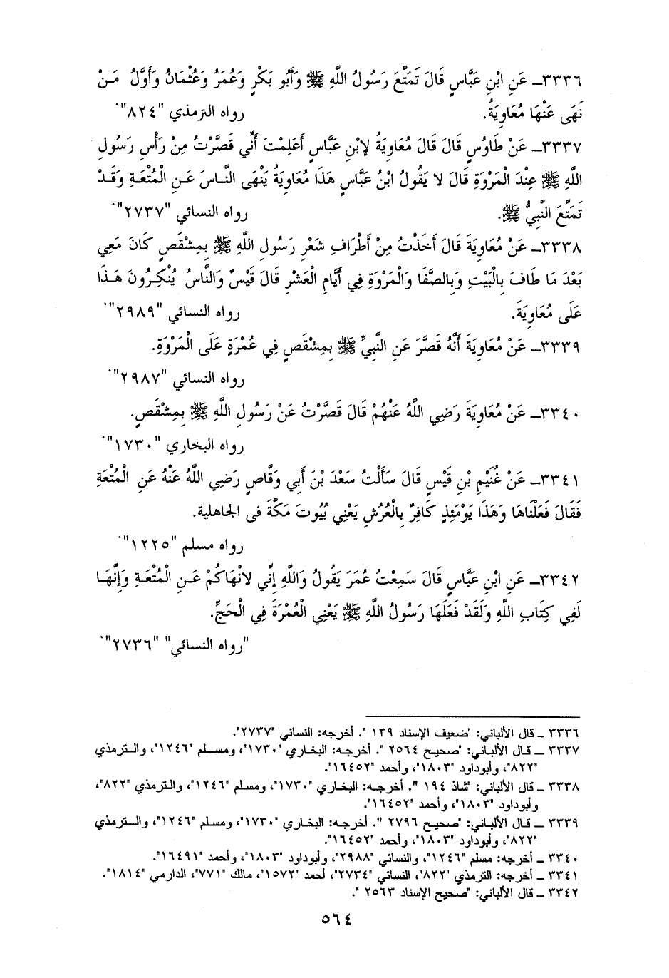 3342 - ابْن عَبَّاسٍ: سَمِعْتُ عُمَرَ يَقُولُ: وَالله لا أنْهَاكُمْ عَنِ الْمُتْعَةِ، فَإِنَّهَا لَفِي كِتَابِ الله، وَلَقَدْ فَعَلَهَا رَسُولُ الله - صلى الله عليه وسلم -، يَعْنِي: الْعُمْرَةَ فِي الْحَجِّ. للنسائي (¬1).