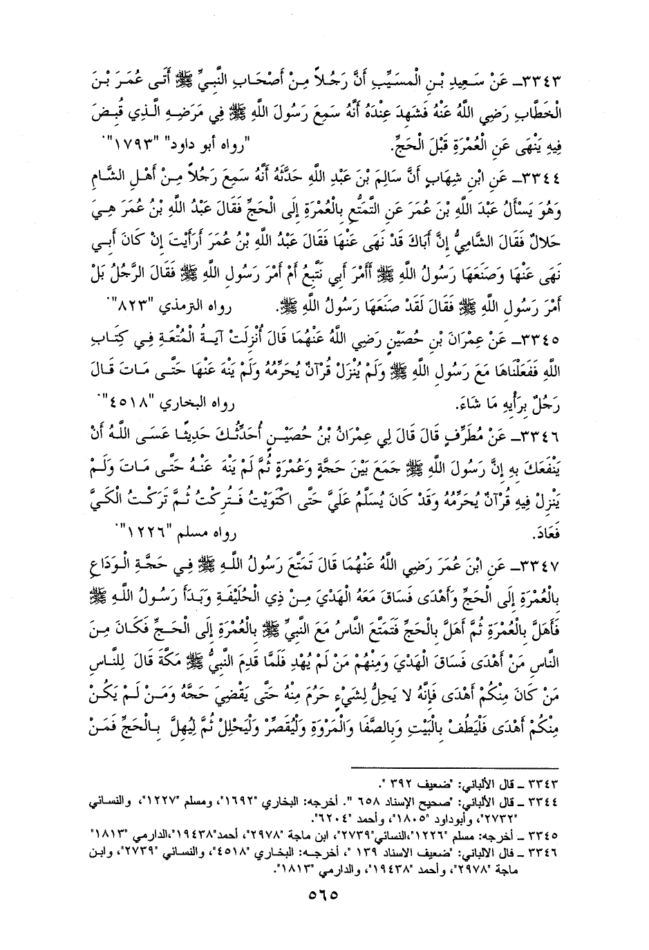 3343 - ابن الْمسَيبِ: أَنَّ رَجُلاً مِنْ أَصْحَابِ النَّبِيِّ - صلى الله عليه وسلم - أَتَى عُمَرَ فَشَهِدَ عِنْدَهُ أَنَّهُ سَمِعَ رَسُولَ الله - صلى الله عليه وسلم - فِي مَرَضِهِ الَّذِي قُبِضَ منه يَنْهَى عَنِ الْعُمْرَةِ قَبْلَ الْحَجِّ. لأبي داود (¬1).