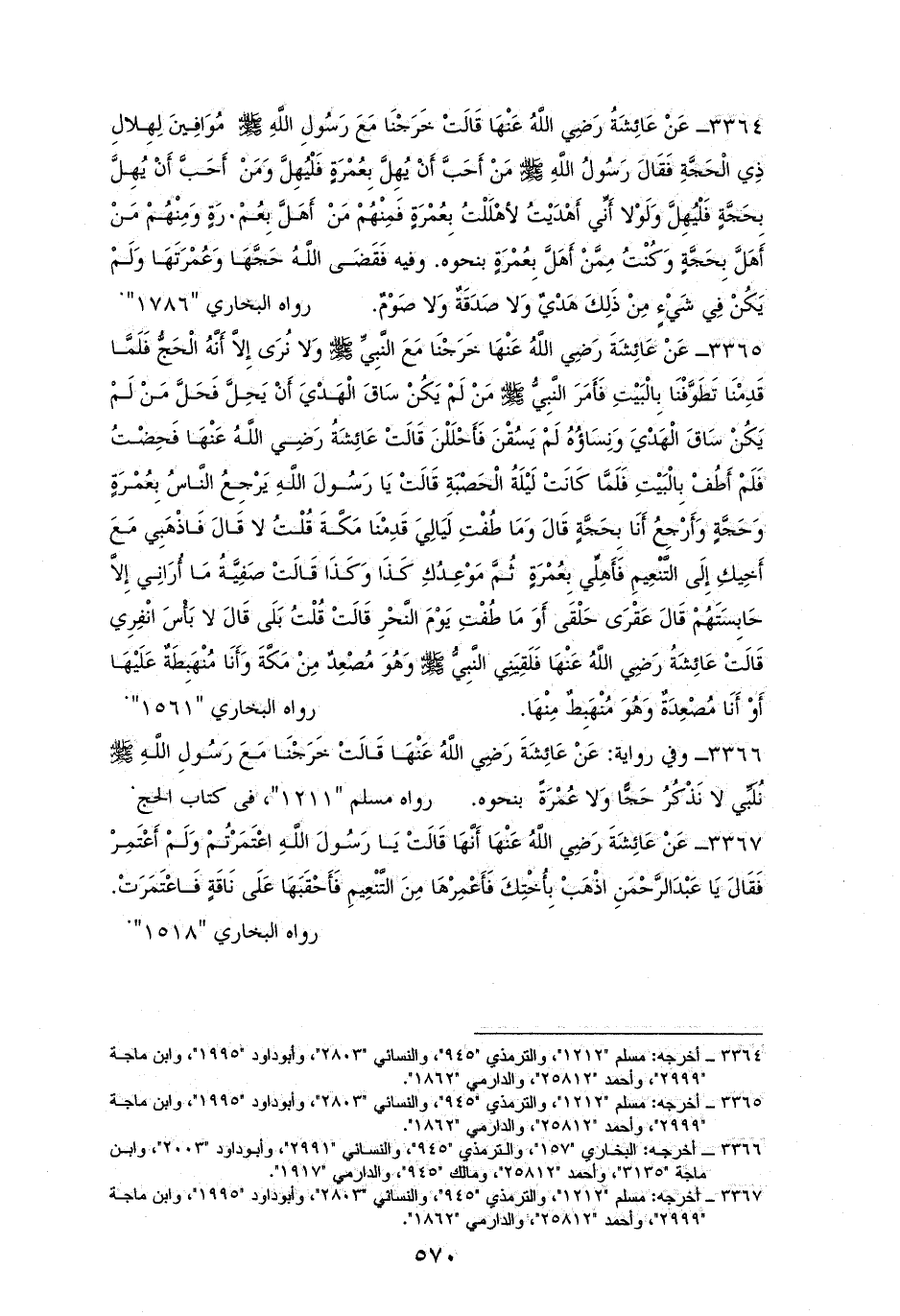 3365 - ومنها: خَرَجْنَا مَعَ رسول الله - صلى الله عليه وسلم - لا نرَى إِلاَّ أَنَّهُ الْحَجُّ فَلَمَّا قَدِمْنَا تَطَوَّفْنَا بِالْبَيْتِ فَأَمَرَ - صلى الله عليه وسلم - مَنْ لَمْ يَكُنْ سَاقَ الْهَدْيَ أَنْ يَحِلَّ، فَحَلَّ مَنْ لَمْ يَكُنْ سَاقَ الْهَدْيَ وَنِسَاؤُهُ لَمْ يَسُقْنَ فَأَحْلَلْنَ، فَحِضْتُ فَلَمْ أَطُفْ، فَلَمَّا كَانَتْ لَيْلَةُ الْحَصْبَةِ، قَلتْ: يَا رَسُولَ الله، يَرْجِعُ النَّاسُ بحجةٍ وِعُمْرَةٍ وَأَرْجِعُ أَنَا بِحَجَّةٍ؟!. قَالَ: ((أوَمَا كنت طُفْتِ لَيَالِيَ قَدِمْنَا مَكَّةَ)) قُلْتُ: لا، قَالَ: ((فَاذْهَبِي مَعَ أَخِيكِ إِلَى التَّنْعِيمِ فَأَهِلِّي بِعُمْرَةٍ، ثُمَّ مَوْعِدُكِ مكان كَذَا وَكَذَا)) قَالَتْ صَفِيَّةُ: مَا أُرَانِي إِلاَّ حَابِسَتَكمْ قَالَ: ((عَقْرَى حَلْقَى، أَوَ مَا كنت طُفْتِ يَوْمَ النَّحْرِ؟)) قَالَتْ: بَلَى، قَالَ: ((لا بَأْسَ عليك انْفِرِي)) قَالَتْ عَائِشَةُ: فَلَقِيَنِي رسول الله - صلى الله عليه وسلم - وَهُوَ مُصْعِدٌ مِنْ مَكَّةَ وَأَنَا مُنْهَبِطَةٌ عَلَيْهَا، أَوْ أَنَا مُصْعِدَةٌ وَهُوَ مُنْهَبِطٌ مِنْهَا (¬1).