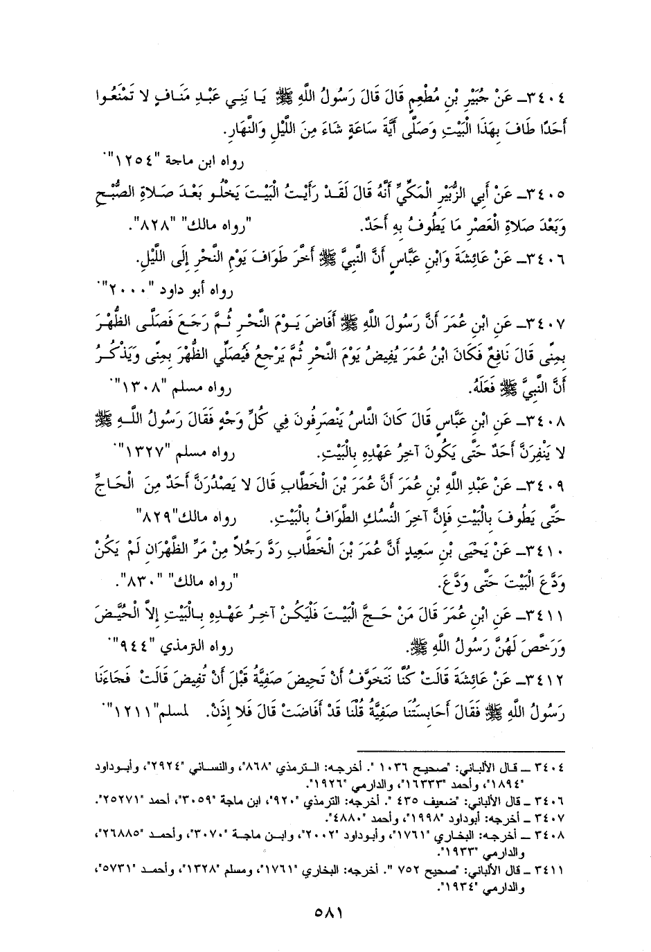 3404 - جُبَيْر بْن مُطْعِمٍ رفعه: ((يَا بَنِي عَبْدِ مَنَافٍ، لا تَمْنَعُوا أَحَدًا طَافَ بِهَذَا الْبَيْتِ وَصَلَّى أَيَّةَ سَاعَةٍ شَاءَ مِنَ ليْلِ أو نهَارِ)). لأصحاب السنن (¬1).