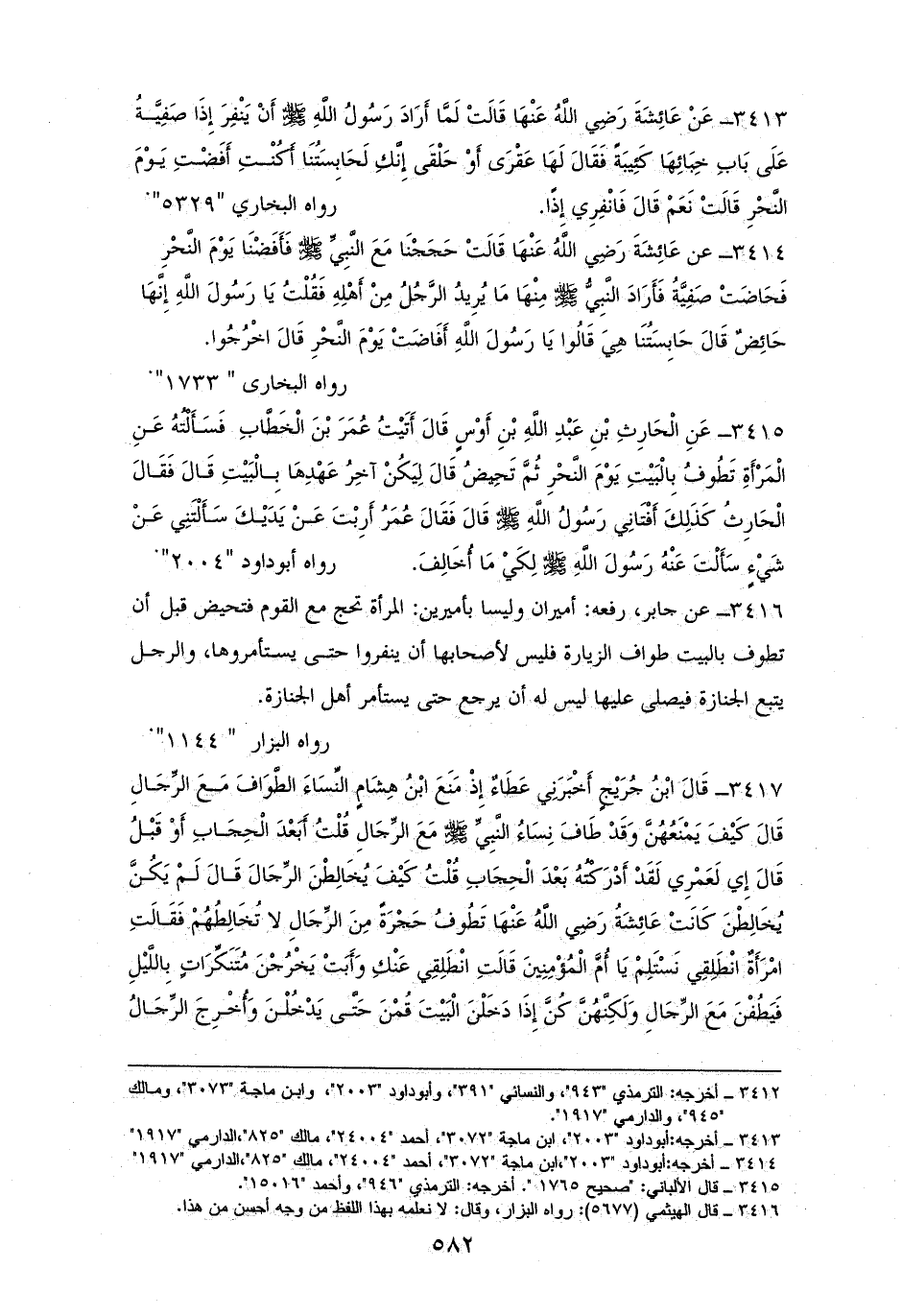 3416 - جابر رفعه: ((أميران وليسا بأميرين: المرأة تحج مع القوم فتحيض قبل أن تطوف طواف الزيارة، فليس لأصحابها أن ينفروا حتى يستأمروها، والرجل يتبع الجنازة فيصلى عليها ليس له أن يرجع حتى يستأمر أهل الجنازة)). للبزار (¬1).