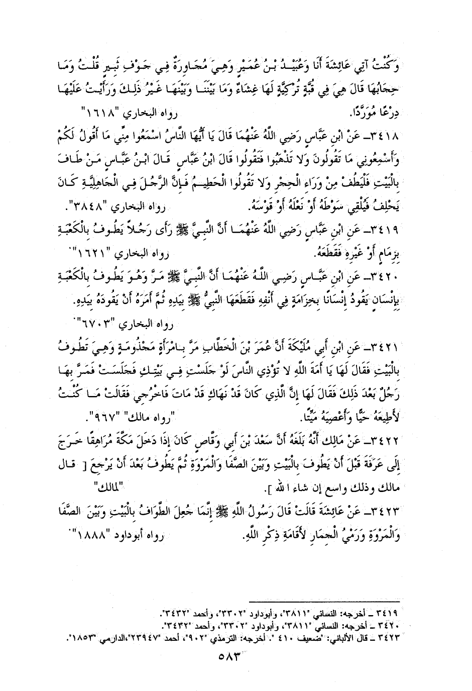 3419 - وعنه: أَنَّ النَّبِيَّ - صلى الله عليه وسلم - رَأَى رَجُلاً يَطُوفُ بِالْكَعْبَةِ بِزِمَامٍ أَوْ غَيْرِهِ فَقَطَعَهُ (¬1).