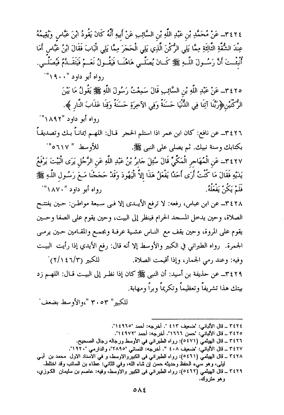 3428 - ابنُ عباس رفعه: ((لا ترفع الأيدي إلا في سبع مواطن: حين تفتح الصلاة، وحين يدخل المسجد الحرام فينظر إلى البيت، وحين يقوم على الصفا، وحين يقوم على المروة، وحين يقف مع الناس بعرفة وبجمع والمقامين حين يرمي الجمرة)). «للكبير»،و «الأوسط» (¬1).