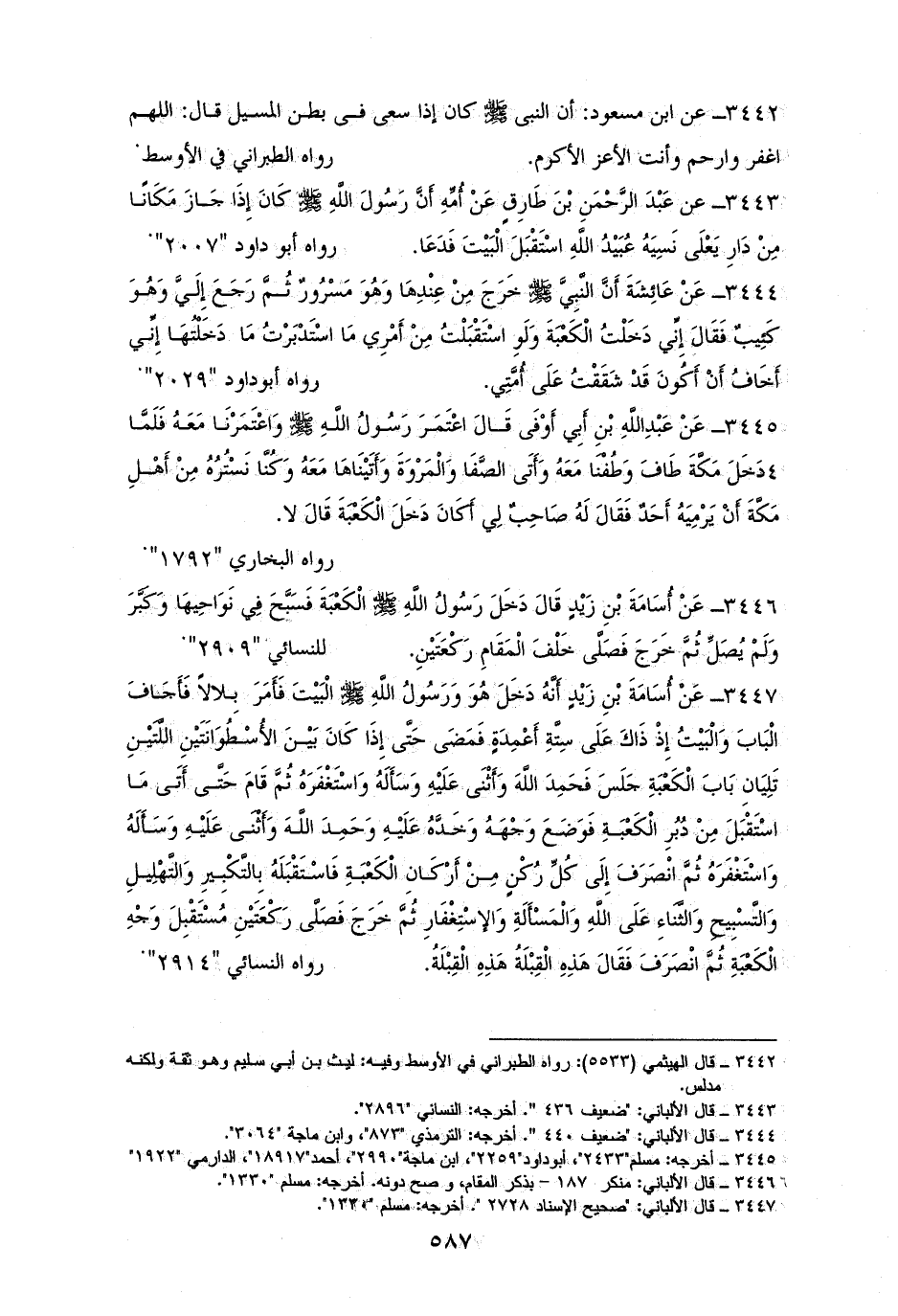 3446 - أُسَامَة: دَخَلَ رَسُولُ الله - صلى الله عليه وسلم - الْكَعْبَةَ فَسَبَّحَ فِي نَوَاحِيهَا وَلَمْ يُصَلِّ، ثُمَّ خَرَجَ فَصَلَّى خَلْفَ الْمَقَامِ رَكْعَتَيْنِ. لمسلم، والنسائي، بلفظه (¬1)