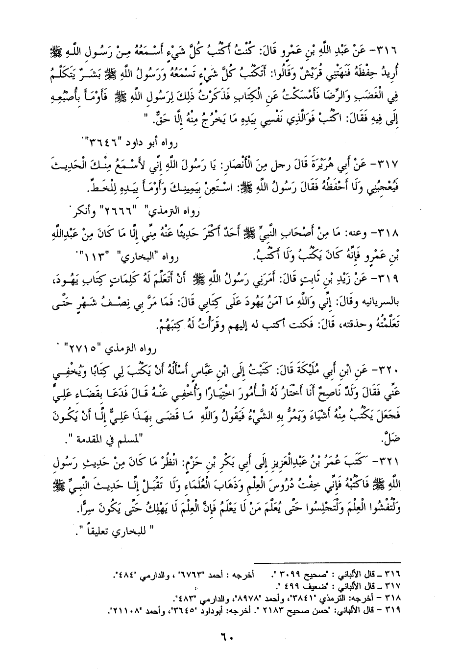 316 - ابْنُ عَمْرٍو بن العاص: كُنْتُ أَكْتُبُ كُلَّ شَيْءٍ سْمَعته مِنْ رَسُولِ الله - صلى الله عليه وسلم -، فَنَهَتْنِي قُرَيْشٌ وَقَالُوا: تَكْتُبُ كُلَّ شَيْءٍ وَرَسُولُ الله - صلى الله عليه وسلم - بَشَرٌ يَتَكَلَّمُ فِي الْغَضَبِ وَالرِّضَا، فَأَمْسَكْتُ عَنِ الْكِتَابة حتى ذَكَرْتُ ذَلِكَ لِرَسُولِ الله - صلى الله عليه وسلم -، فَأَوْمَأَ بِأُصْبُعِهِ إِلَى فِيهِ، فَقَالَ: ((اكْتُبْ فَوَالَّذِي نَفْسِي بِيَدِهِ مَا يَخْرُجُ مِنْهُ إِلَّا حَقًا)). لأبي داود (¬1).