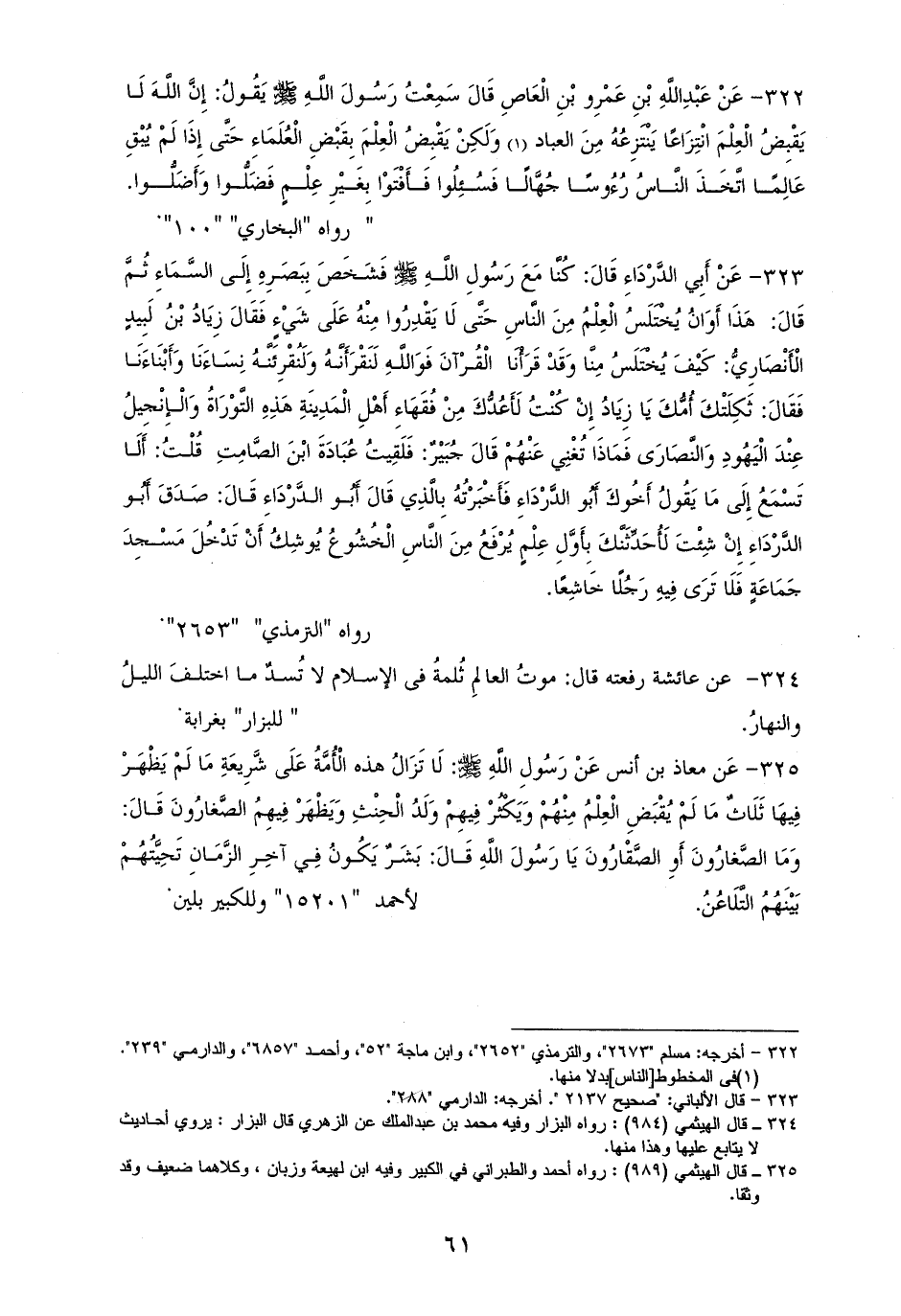 322 - ابْنِ عَمْرِو بْنِ الْعَاصِ رفعه: ((إِنَّ الله لَا يَقْبِضُ الْعِلْمَ انْتِزَاعًا يَنْتَزِعُهُ مِنَ الْناس، وَلَكِنْ يَقْبِضُ الْعِلْمَ بِقَبْضِ الْعُلَمَاءِ حَتَّى إِذَا لَمْ يُبْقِ عَالِمًا، اتَّخَذَ النَّاسُ رُءُوسًا جُهَّالًا، فَسُئِلُوا فَأَفْتَوْا بِغَيْرِ عِلْمٍ، فَضَلُّوا وَأَضَلُّوا)). للشيخين والترمذي (¬1).