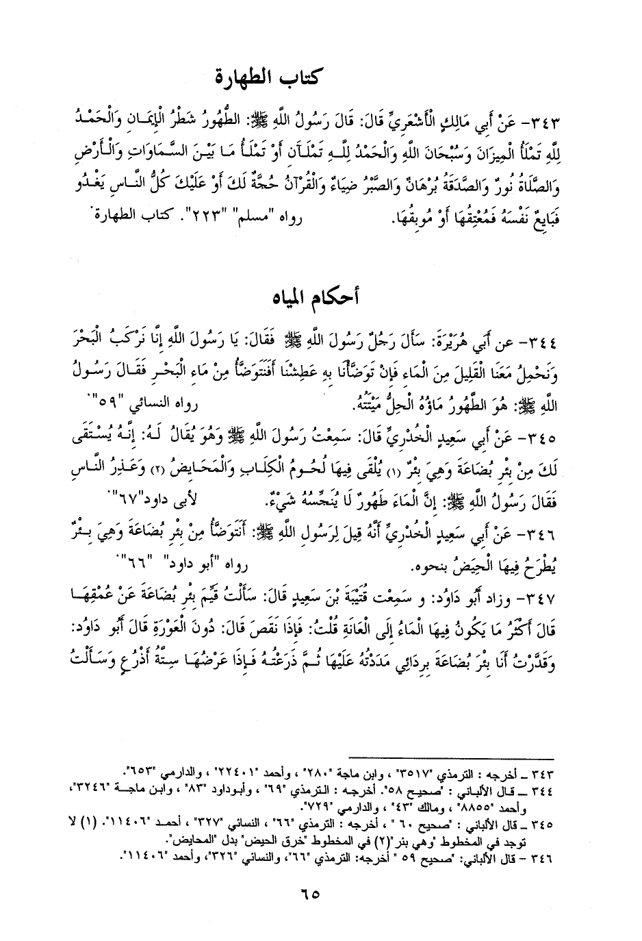 344 - أبو هُرَيْرَةَ: جاء رَجُلٌ إلى النبي - صلى الله عليه وسلم - فَقَالَ: إِنَّا نَرْكَبُ الْبَحْرَ ومَعَنَا الْقَلِيلَ مِنَ الْمَاءِ، فَإِنْ تَوَضَّأْنَا بِهِ عَطِشْنَا، أَفَنَتَوَضَّأُ مِنْ مَاءِ الْبَحْرِ؟ فَقَالَ: ((هُوَ الطَّهُورُ مَاؤُهُ الْحِلُّ مَيْتَتُهُ)). للموطأ وأصحاب السنن (¬1).