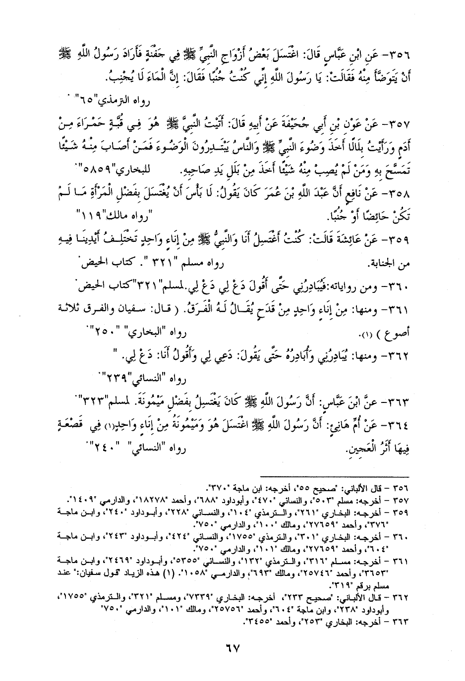 359 - عَائِشَةَ: كُنْتُ أَغْتَسِلُ أَنَا وَالنَّبِيُّ - صلى الله عليه وسلم - مِنْ إِنَاءٍ وَاحِدٍ، تَخْتَلِفُ أَيْدِينَا فِيهِ من الجنابة. للشيخين وأبي داود والنسائي (¬1).