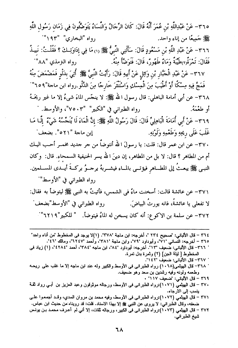 370 - ابن عمر: قلت: يا رسولَ الله أنتوضاٌ من جر جديد مخمر أحب اليك أم من المطاهر؟ قال: لا بل من المطاهر، إن دينَ الله يسر الحنيفية السمحاءِ. قال: وكان النبى - صلى الله عليه وسلم - يبعثُ الى المطاهرِ، فيؤتى بالماء فيشربهُ، يرجوُ بركةَ أيدى المسلمين (¬1).للأوسط.