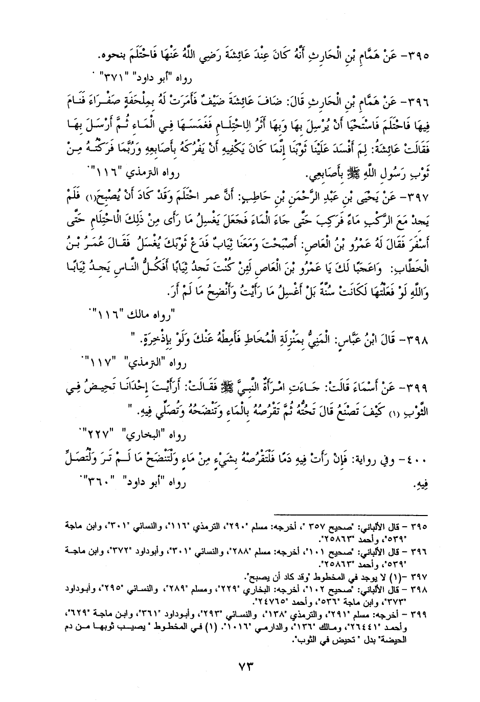 396 - وللترمذي أنها أَمَرَتْ لضيف بِمِلْحَفَةٍ صَفْرَاءَ، فَنَامَ فِيهَا فَاحْتَلَمَ، فَاسْتَحْيَا أَنْ يُرْسِلَ بِهَا إليها وَبِهَا أَثَرُ الِاحْتِلَامِ، فَغَمَسَهَا فِي الْمَاءِ ثُمَّ أَرْسَلَ بِهَا، فَقَالَتْ: لِمَ أَفْسَدَ عَلَيْنَا ثَوْبَنَا؟ إِنَّمَا كَانَ يَكْفِيهِ أَنْ يَفْرُكَهُ بِأَصَابِعِهِ، وَرُبَّمَا فَرَكْتُهُ مِنْ ثَوْبِ رَسُولِ الله - صلى الله عليه وسلم - بِأَصَابِعِي (¬1).