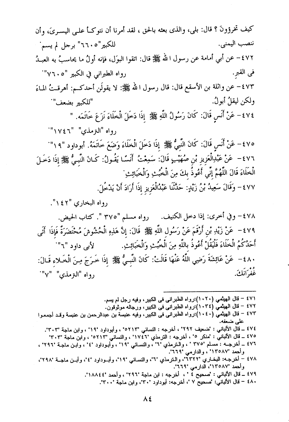 480 - عَائِشَة: كَانَ النَّبِيُّ - صلى الله عليه وسلم - إِذَا خَرَجَ مِنَ الْخَلاءِ قَالَ: غُفْرَانَكَ. للترمذي وأبي داود (¬1).