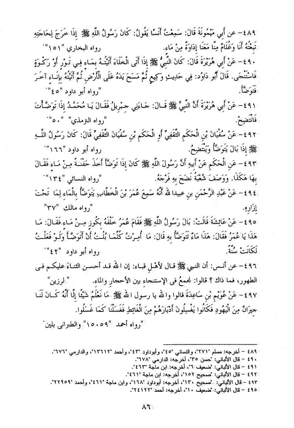 492 - سُفْيَان بْنِ الْحَكَمِ أَوِ الْحَكَمِ بْنِ سُفْيَانَ: كَانَ النبي - صلى الله عليه وسلم - إِذَا بَالَ يتَوَضَّأُ وَيَنْتَضِحُ. لأبي داود (¬1).