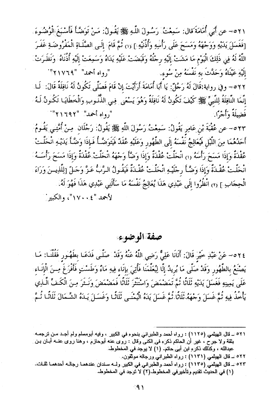 521 - أبو أُمَامَةََ رفعه: ((مَنْ تَوَضَّأَ فَأَسْبَغَ الْوُضُوءَ ثُمَّ قَامَ إِلَى الصَّلَاةِ الْمَفْرُوضَةِ، غَفَرَ الله لَهُ فِي ذَلِكَ الْيَوْمِ مَا مَشَتْ رجلاه وَقَبَضَتْ عَلَيْهِ يَدَاهُ وَسَمِعَتْ إِلَيْهِ أُذُنَاهُ وَنَظَرَتْ إِلَيْهِ عَيْنَاهُ وَحَدَّثَ بِهِ نَفْسَهُ مِنْ سُوءٍ)) (¬1).
