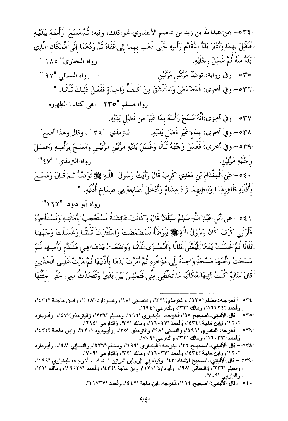 534 - وللستة عن عبد الله بن زيد بن عاصم الأنصاري: نحو ذلك، وفيه: فمَسَحَ برَأْسَهُ فأقبل بِيَدَيْهِ وَأَدْبَرَ بَدَأَ بِمُقَدَّمِ رَأْسِهِ ثم ذَهَبَ بِهِمَا إِلَى قَفَاهُ ثُمَّ رَدَّهُمَا حتى رجع إِلَى الْمَكَانِ الَّذِي بَدَأَ مِنْهُ (¬1).