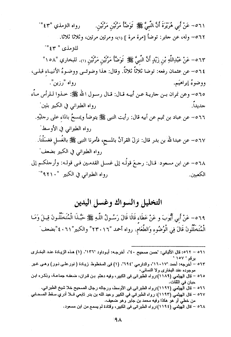 566 - عباد بن تميم، عن أبيه: رأيت النبى - صلى الله عليه وسلم - يتوضأ ويمسحُ بالماءِ على رجليْهِ. للأوسط (¬1).