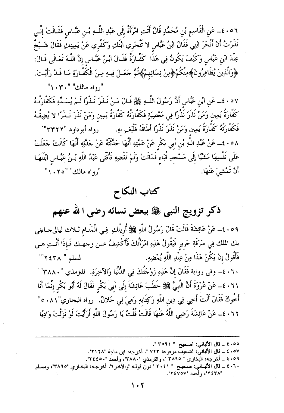 4057 - ((مَنْ نَذَرَ نَذْرًا لَمْ يُسَمِّهِ فَكَفَّارَتُهُ كَفَّارَةُ يَمِينٍ، وَمَنْ نَذَرَ نَذْرًا فِي مَعْصِيَةٍ فَكَفَّارَتُهُ كَفَّارَةُ يَمِينٍ، وَمَنْ نَذَرَ نَذْرًا لا يُطِيقُهُ فَكَفَّارَتُهُ كَفَّارَةُ يَمِينٍ، وَمَنْ نَذَرَ نَذْرًا أَطَاقَهُ فَلْيَفِ بِهِ)). لأبي داود (¬1).