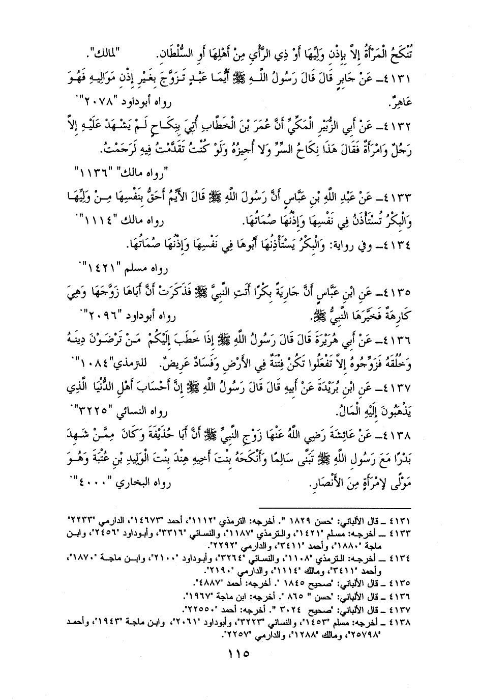 4134 - وفي رواية: ((وَالْبِكْرُ يَسْتَأْذِنُهَا أَبُوهَا فِي نَفْسِهَا، وَإِذْنُهَا صماتُهَا)). للستة إلا البخاري (¬1).