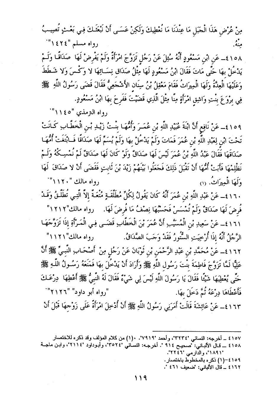 4159 - نافعٌ: في امرأة مات زوجها، ولم يقربها وكان لم يسم لها صداقًا، فقضى ابن عمر وزيد بن ثابت أن لا صداق لها، ولها الميراث.