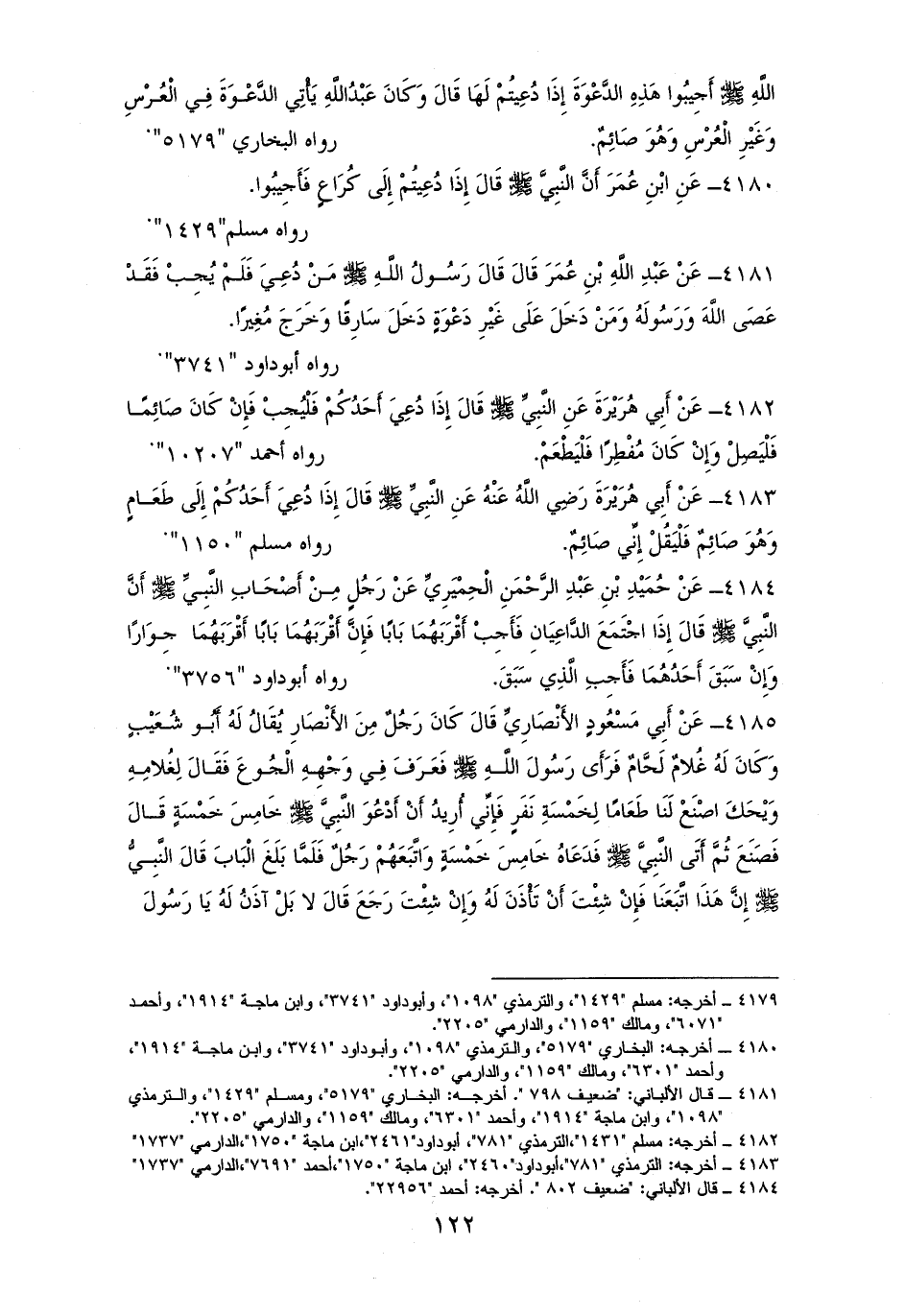 4181 - وفي أخرى: ((مَنْ دُعِيَ فَلَمْ يُجِبْ فَقَدْ عَصَى الله وَرَسُولَهُ، وَمَنْ دَخَلَ عَلَى غَيْرِ دَعْوَةٍ دَخَلَ سَارِقًا، وَخَرَجَ مُغِيرًا)). للشيخين، وأبي داود، والترمذي (¬1).