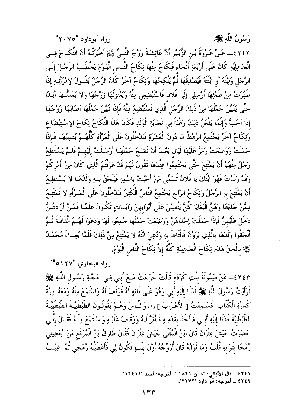 4242 - عَائِشَةُ: أَنَّ النِّكَاحَ فِي الْجَاهِلِيَّةِ كَانَ عَلَى أَرْبَعَةِ أَنْحَاءٍ، فَنِكَاحٌ مِنْهَا نِكَاحُ النَّاسِ الْيَوْمَ يَخْطُبُ الرَّجُلُ إِلَى الرَّجُلِ وَلِيَّتَهُ أَوِ ابْنَتَهُ، فَيُصْدِقُهَا ثُمَّ يَنْكِحُهَا، وَنِكَاحٌ آخَرُ كَانَ الرَّجُلُ يَقُولُ لامْرَأَتِهِ: إِذَا طَهُرَتْ مِنْ طَمْثِهَا أَرْسِلِي إِلَى فُلانٍ فَاسْتَبْضِعِي مِنْهُ، وَيَعْتَزِلُهَا زَوْجُهَا، وَلا يَمَسُّهَا حَتَّى يَتَبَيَّنَ حَمْلُهَا مِنْ ذَلِكَ الرَّجُلِ، فَإِذَا تَبَيَّنَ حَمْلُهَا أَصَابَهَا زَوْجُهَا إِذَا أَحَبَّ، وَإِنَّمَا يَفْعَلُ ذَلِكَ رَغْبَةً فِي نَجَابَةِ الْوَلَدِ هَذَا النِّكَاحُ: نِكَاحَ الاسْتِبْضَاعِ، وَنِكَاحٌ آخَرُ: يَجْتَمِعُ الرَّهْطُ مَا دُونَ الْعَشَرَةِ فَيَدْخُلُونَ عَلَى الْمَرْأَةِ كُلُّهُمْ يُصِيبُهَا، فَإِذَا حَمَلَتْ وَوَضَعَتْ وَمَرَّ لَيَالٍ بَعْدَ أَنْ تَضَعَ حَمْلَهَا أَرْسَلَتْ إِلَيْهِمْ فَلَمْ يَسْتَطِعْ رَجُلٌ مِنْهُمْ أَنْ يَمْتَنِعَ حَتَّى يَجْتَمِعُوا عِنْدَهَا، تقول لَهُمْ: قَدْ عَرَفْتُمُ الَّذِي كَانَ مِنْ أَمْرِكُمْ، وَقَدْ وَلَدْتُ فَهُوَ ابْنُكَ يَا فُلانُ تُسَمِّي مَنْ أَحَبَّتْ بِهِ وَلَدُهَا لا يَسْتَطِيعُ أَنْ يَمْتَنِعَ الرَّجُلُ، وَنِكَاحُ رَّابِعِ: يَجْتَمِعُ النَّاسُ الْكَثِيرُ فَيَدْخُلُونَ عَلَى الْمَرْأَةِ لا تَمْتَنِعُ مِمَّنْ جَاءَهَا، وَهُنَّ الْبَغَايَا كُنَّ يَنْصِبْنَ عَلَى أَبْوَابِهِنَّ رَايَاتٍ تَكُونُ عَلَمًا، فَمَنْ أَرَادَهُنَّ دَخَلَ عَلَيْهِنَّ فَإِذَا حَمَلَتْ إِحْدَاهُنَّ، وَوَضَعَتْ حَمْلَهَا، جُمِعُوا لَهَا، وَدَعَوْا لها الْقَافَةَ، ثُمَّ أَلْحَقُوا وَلَدَهَا بِالَّذِي يَرَوْنَ فَالْتَاطَ بِهِ، وَدُعِيَ ابْنهُ، لا يَمْتَنِعُ مِنْ ذَلِكَ، فَلَمَّا بُعِثَ مُحَمَّدٌ (بِالْحَقِّ، هَدَمَ نِكَاحَ