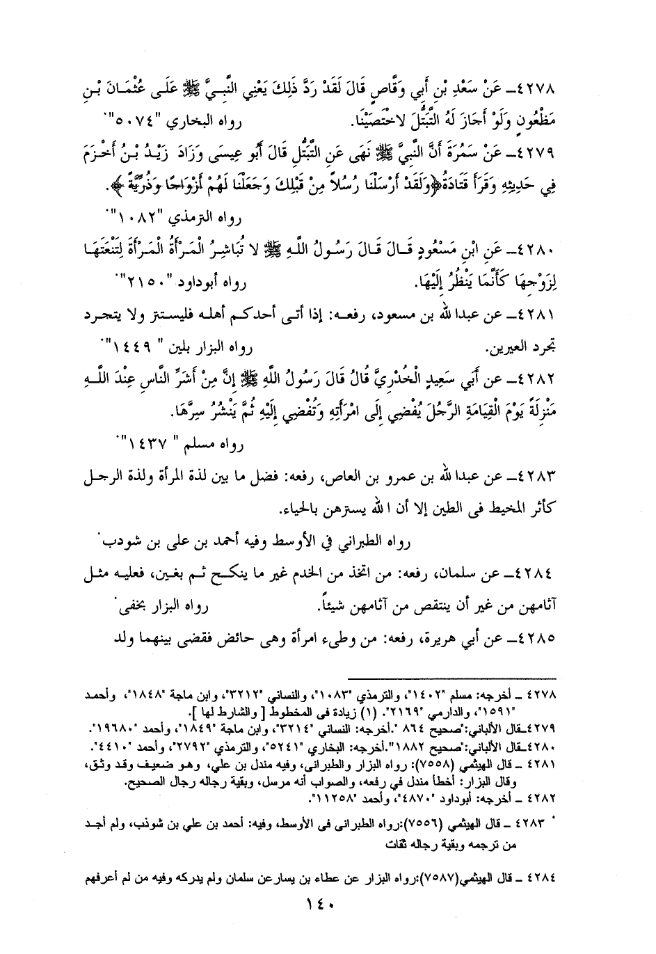 4284 - سلمانُ رفعه: ((من اتخذ من الخدم غير ما ينكح ثم بغين، فعليه مثل آثامهن من غير أن ينقص من آثامهن شيء)). للبزار بخفي (¬1).