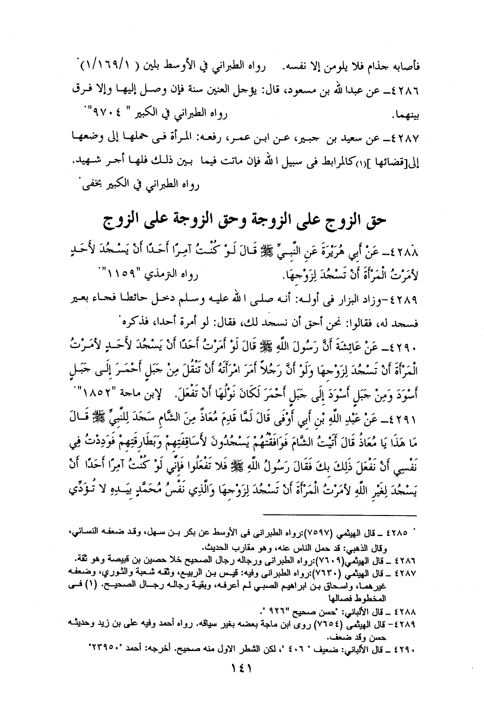 4288 - أبو هُرَيْرَةَ رفعه: ((لَوْ كُنْتُ آمِرًا أَحَدًا أَنْ يَسْجُدَ لأَحَدٍ لَأَمَرْتُ الزوجة أَنْ تَسْجُدَ لِزَوْجِهَا)). للترمذي (¬1).