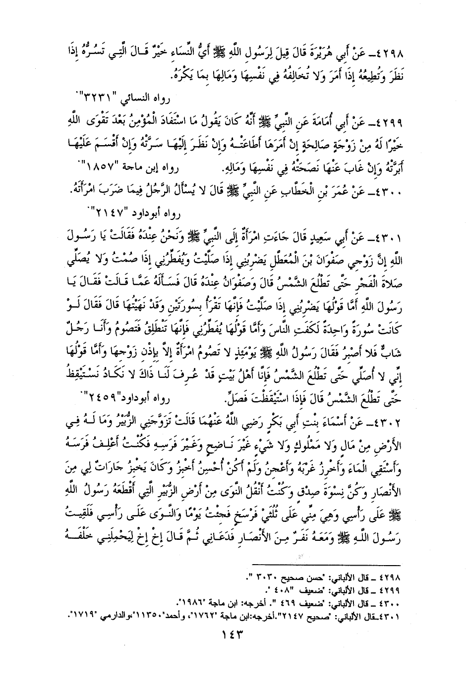 4298 - أبو هُرَيْرَةَ: قِيلَ لِرَسُولِ الله - صلى الله عليه وسلم - أَيُّ النِّسَاءِ خَيْرٌ؟ قَالَ: ((الَّتِي تَسُرُّهُ إِذَا نَظَرَ، وَتُطِيعُهُ إِذَا أَمَرَ، وَلا تُخَالِفُهُ فِي نَفْسِهَا ولا مَالِهَا بِمَا يَكْرَهُ)). للنسائي (¬1).