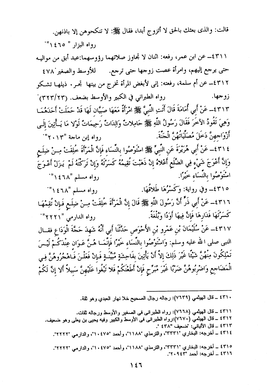 4317 - عَمْروُ بْنُ الأَحْوَصِ رفعه: ((ألا وَاسْتَوْصُوا بِالنِّسَاءِ خَيْرًا؛ فَإِنَّمَا هُنَّ عَوَانٍ عِنْدَكُمْ، لَيْسَ تَمْلِكُونَ مِنْهُنَّ شَيْئًا غَيْرَ ذَلِكَ إِلاَّ أَنْ يَأْتِينَ بِفَاحِشَةٍ مُبَيِّنَةٍ، فَإِنْ فَعَلْنَ فَاهْجُرُوهُنَّ فِي الْمَضَاجِعِ، وَاضْرِبُوهُنَّ ضَرْبًا غَيْرَ مُبَرِّحٍ، فَإِنْ أَطَعْنَكُمْ فَلا تَبْغُوا عَلَيْهِنَّ سَبِيلاً. أَلا إِنَّ لَكُمْ