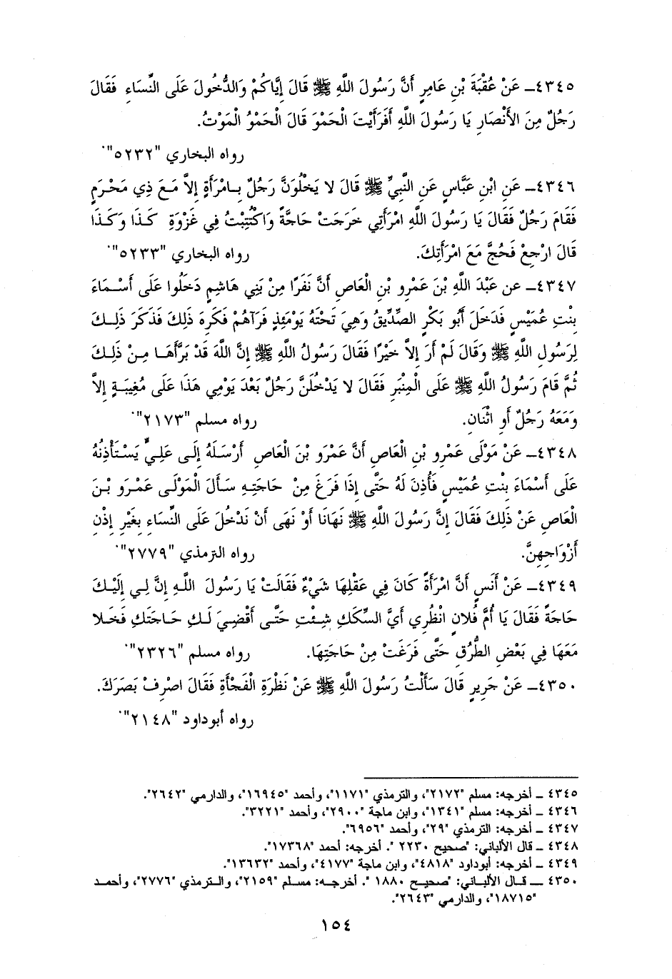 4347 - ابنُ عَمْرِو بْنِ الْعَاصِ أَنَّ نَفَرًا مِنْ بَنِي هَاشِمٍ دَخَلُوا عَلَى أَسْمَاءَ بِنْتِ عُمَيْسٍ فَدَخَلَ أَبُو بَكْرٍ وَهِيَ يَوْمَئِذٍ تَحْتَهُ فَرَآهُمْ فَكَرِهَ ذَلِكَ فذكره للنبي - صلى الله عليه وسلم - وَقَالَ: لَمْ أَرَ إِلاَّ خَيْرًا فَقَالَ - صلى الله عليه وسلم - ((إِنَّ الله قَدْ بَرَّأَهَا مِنْ ذَلِكَ)) ثُمَّ قَامَ رَسُولُ الله - صلى الله عليه وسلم - عَلَى الْمِنْبَرِ فَقَالَ: ((لا يَدْخُلَنَّ رَجُلٌ بَعْدَ يَوْمِي هَذَا عَلَى مُغِيبَةٍ إِلاَّ وَمَعَهُ رَجُلٌ أَوِ اثْنَانِ)). لمسلم (¬1).