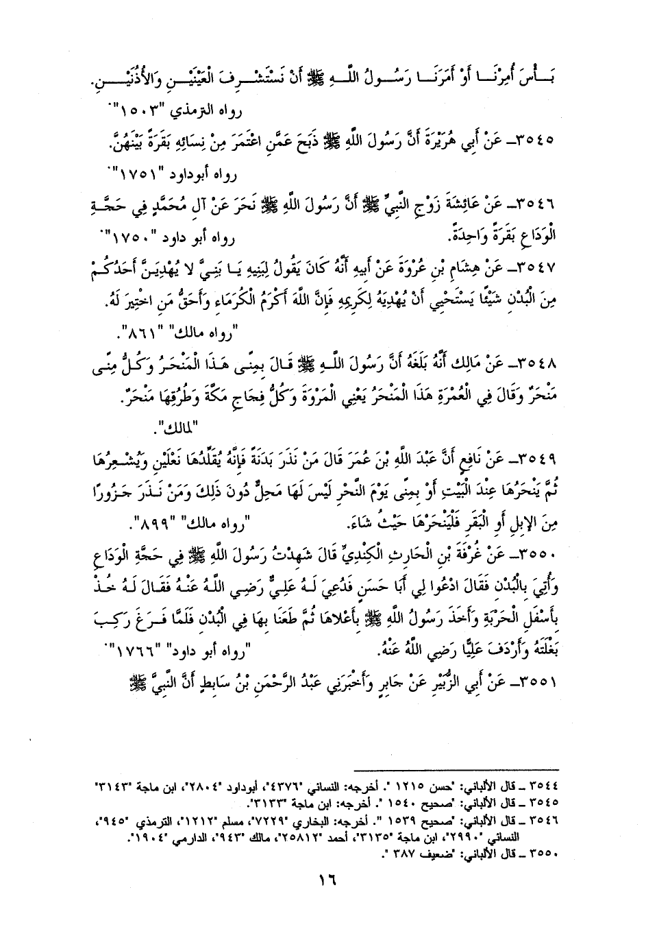 3545 - أبو هُرَيْرَةَ: أَنَّ النبي - صلى الله عليه وسلم - ذَبَحَ عَمَّنِ اعْتَمَرَ مِنْ نِسَائِهِ بَقَرَةً بَيْنَهُنَّ. لأبي داود (¬1).