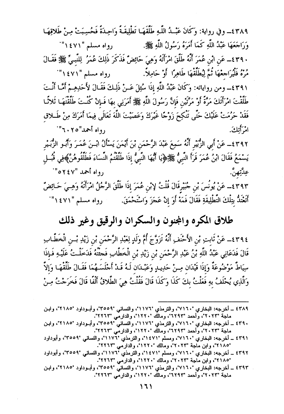 4389 - ومن رواياته: وَكَانَ عَبْدُ الله طَلَّقَهَا تَطْلِيقَةً وَاحِدَةً، فَحُسِبَتْ مِنْ طَلاقِهَا وَرَاجَعَهَا كَمَا أَمَرَهُ - صلى الله عليه وسلم - (¬1).