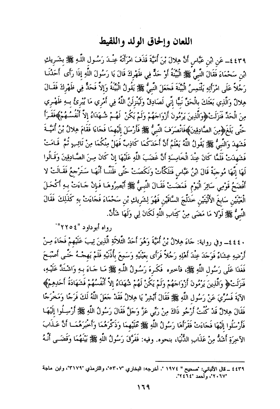 4439 - ابْنُ عَبَّاسٍ: أَنَّ هِلالَ بْنَ أُمَيَّةَ قَذَفَ امْرَأَتَهُ عِنْدَ النبي - صلى الله عليه وسلم - بِشَرِيكِ ابْنِ سَحْمَاءَ، فَقَالَ - صلى الله عليه وسلم -: ((الْبَيِّنَةُ أَوْ حَدٌّ فِي ظَهْرِكَ)). قَالَ: يَا رَسُولَ الله، إِذَا رَأَى أَحَدُنَا رَجُلاً عَلَى امْرَأَتِهِ يَلْتَمِسُ الْبَيِّنَةَ. فَجَعَلَ - صلى الله عليه وسلم - يَقُولُ: ((الْبَيِّنَةُ وَإِلاَّ حَدٌّ فِي ظَهْرِكَ)) فَقَالَ هِلالٌ: وَالَّذِي بَعَثَكَ بِالْحَقِّ إِنِّي لَصَادِقٌ، وَلَيُنْزِلَنَّ الله فِي أَمْرِي مَا يُبْرِئُ ظَهْرِي مِنَ الْحَدِّ. فَنَزَلَتْ: {وَالَّذِينَ يَرْمُونَ أَزْوَاجَهُمْ} إلى: {الصَّادِقِينَ}. فَأَرْسَلَ - صلى الله عليه وسلم - إِلَيْهِمَا فَجَاءَا، فَقَامَ هِلالُ فَشَهِدَ وَالنَّبِيُّ - صلى الله عليه وسلم - يَقُولُ: ((إن الله يَعْلَمُ أَنَّ أَحَدَكُمَا كَاذِبٌ، فَهَلْ مِنْكُمَا مِنْ تَائِبٍ)) ثُمَّ قَامَتْ فَشَهِدَتْ، فَلَمَّا كَانَ عِنْدَ الْخَامِسَةِ أَنَّ غَضَبَ الله عَلَيْهَا إِنْ كَانَ مِنَ الصَّادِقِينَ، فقَالُوا: إِنَّهَا مُوجِبَةٌ. فَتَلَكَّأَتْ وَنَكَصَتْ، حَتَّى ظَنَنَّا أَنَّهَا سَتَرْجِعُ، فَقَالَتْ: لا أَفْضَحُ قَوْمِي سَائِرَ الْيَوْمِ، فَمَضَتْ، فَقَالَ - صلى الله عليه وسلم -: ((أَبْصِرُوهَا، فَإِنْ جَاءَتْ بِهِ أَكْحَلَ الْعَيْنَيْنِ، سَابِغَ الأَلْيَتَيْنِ، خَدَلَّجَ السَّاقَيْنِ فَهُوَ لِشَرِيكِ بْنِ سَحْمَاءَ)) فَجَاءَتْ بِهِ كَذَلِكَ، فَقَالَ النَّبِيُّ - صلى الله عليه وسلم -: ((لَوْلا مَا مَضَى مِنْ كِتَابِ الله لَكَانَ لِي وَلَهَا شَأْنٌ)). للبخاري والترمذي وأبي داود بلفظه (¬1).