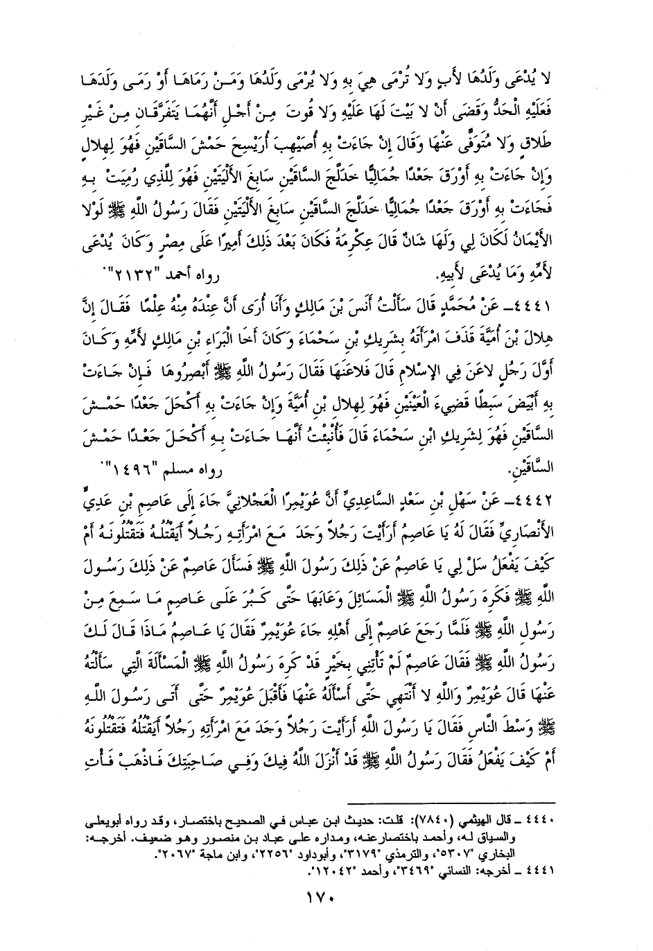4442 - سَهْلِ بْنِ سَعْدٍ السَّاعِدِيِّ: أَنَّ عُوَيْمِر الْعَجْلانِيَّ جَاءَ إِلَى عَاصِمِ بْنِ عَدِيٍّ الأَنْصَارِيِّ فَقَالَ: أَرَأَيْتَ لو أن رَجُلاً وَجَدَ مَعَ امْرَأَتِهِ رَجُلاً أَيَقْتُلُهُ فَتَقْتُلُونَهُ، أَمْ كَيْفَ يَفْعَلُ؟ فاسَأل لِي عَنْ ذَلِكَ رَسُولَ الله - صلى الله عليه وسلم -. فَسَأَلَه عَاصِمٌ، فَكَرِهَ - صلى الله عليه وسلم - الْمَسَائِلَ وَعَابَهَا حَتَّى كَبُرَ عَلَى عَاصِمٍ مَا سَمِعَ مِنْه - صلى الله عليه وسلم -، فَلَمَّا رَجَعَ عَاصِمٌ إِلَى أَهْلِهِ قال له عُوَيْمِرٌ: مَاذَا قَالَ رَسُولُ الله - صلى الله عليه وسلم -؟ قَالَ: عَاصِمٌ لَمْ تَأْتِنِي بِخَيْرٍ، قَدْ كَرِهَ - صلى الله عليه وسلم - الْمَسْاَئل. فقَالَ عُوَيْمِرٌ: وَالله لا أَنْتَهِي حَتَّى أَسْأَلَهُ. فأتي عويمر النبي - صلى الله عليه وسلم - وَسْطَ النَّاسِ فَقَالَ: يَا رَسُولَ الله، أَرَأَيْتَ رَجُلاً وَجَدَ مَعَ امْرَأَتِهِ رَجُلاً أَيَقْتُلُهُ فَتَقْتُلُونَهُ، أَمْ كَيْفَ يَفْعَلُ؟ فَقَالَ - صلى الله عليه وسلم -: ((قَدْ نْزَلَ فِيكَ وَفِي صَاحِبَتِكَ، فَاذْهَبْ فَأْتِ