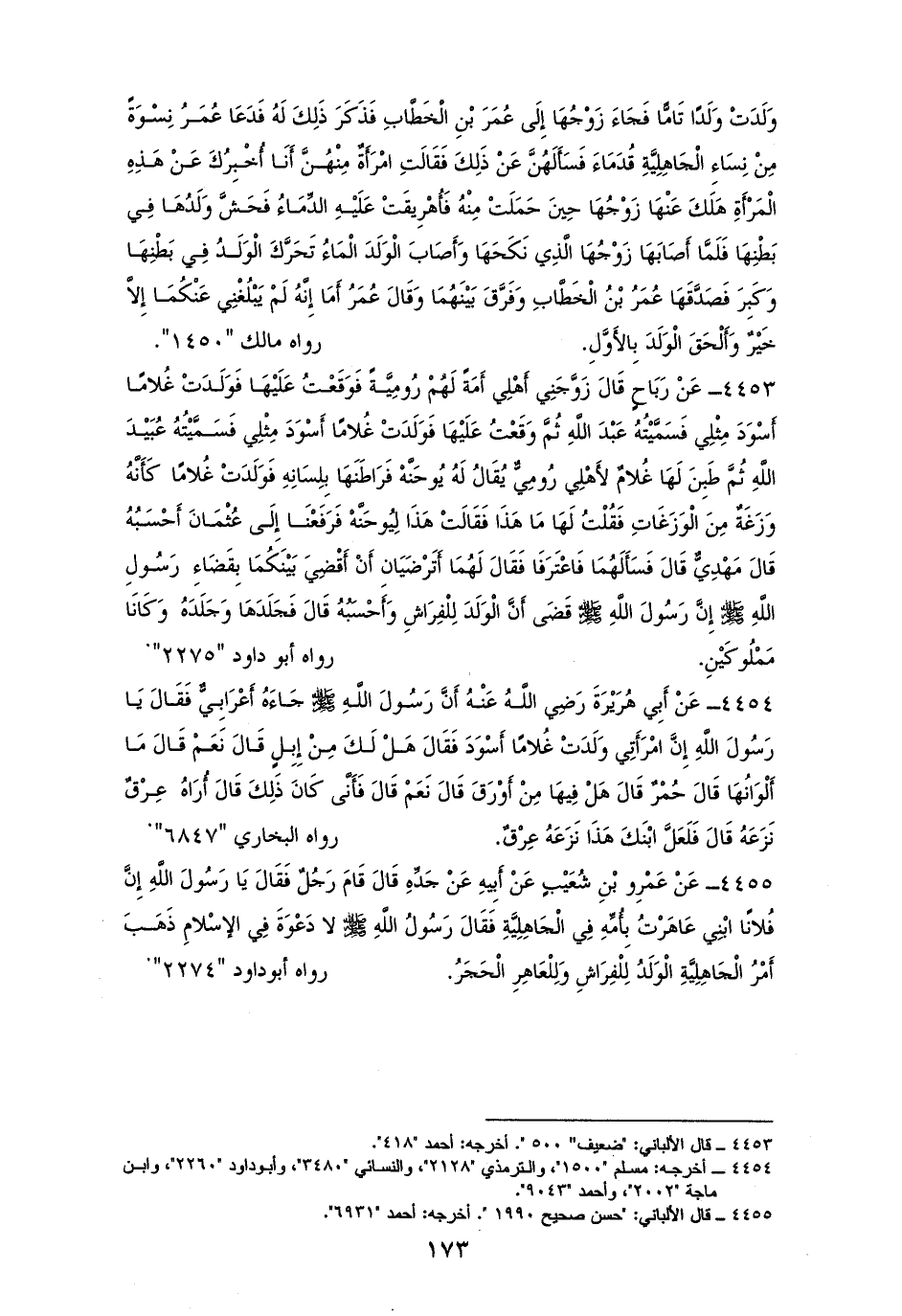 4453 - رَبَاح: زَوَّجَنِي أَهْلِي أَمَةً لَهُمْ رُومِيَّةً، فدخلت بها فَوَلَدَتْ غُلامًا أَسْوَدَ مِثْلِي فَسَمَّيْتُهُ عَبْدَ الله، ثُمَّ وَقَعْتُ عَلَيْهَا فَوَلَدَتْ غُلامًا أَسْوَدَ مِثْلِي فَسَمَّيْتُهُ عُبَيْدَ الله، ثُمَّ طَبَنَ لَهَا غُلامٌ من أهل رُومِي يُقَالُ لَهُ: يُوحَنَّهْ، فَرَاطَنَهَا بِلِسَانِها فَوَلَدَتْ غُلامًا كَأَنَّهُ وَزَغَةٌ مِنَ الْوَزَغَاتِ فَقُلْتُ لَهَا مَا هَذَا فَقَالَتْ هَذَا لِيُوحَنَّهْ. فَرَفَعْنَا إِلَى عُثْمَانَ فَسَأَلَهُمَا فَاعْتَرَفَا، فَقَالَ لَهُمَا: أَتَرْضَيَانِ أَنْ أَقْضِيَ بَيْنَكُمَا بِقَضَاءِ النبي - صلى الله عليه وسلم -؟ أنه قَضَى أَنَّ الْوَلَدَ لِلْفِرَاشِ. فَجَلَدَهَا وَجَلَدَهُ فكَانَا مَمْلُوكَيْنِ. لأبي داود (¬1).
