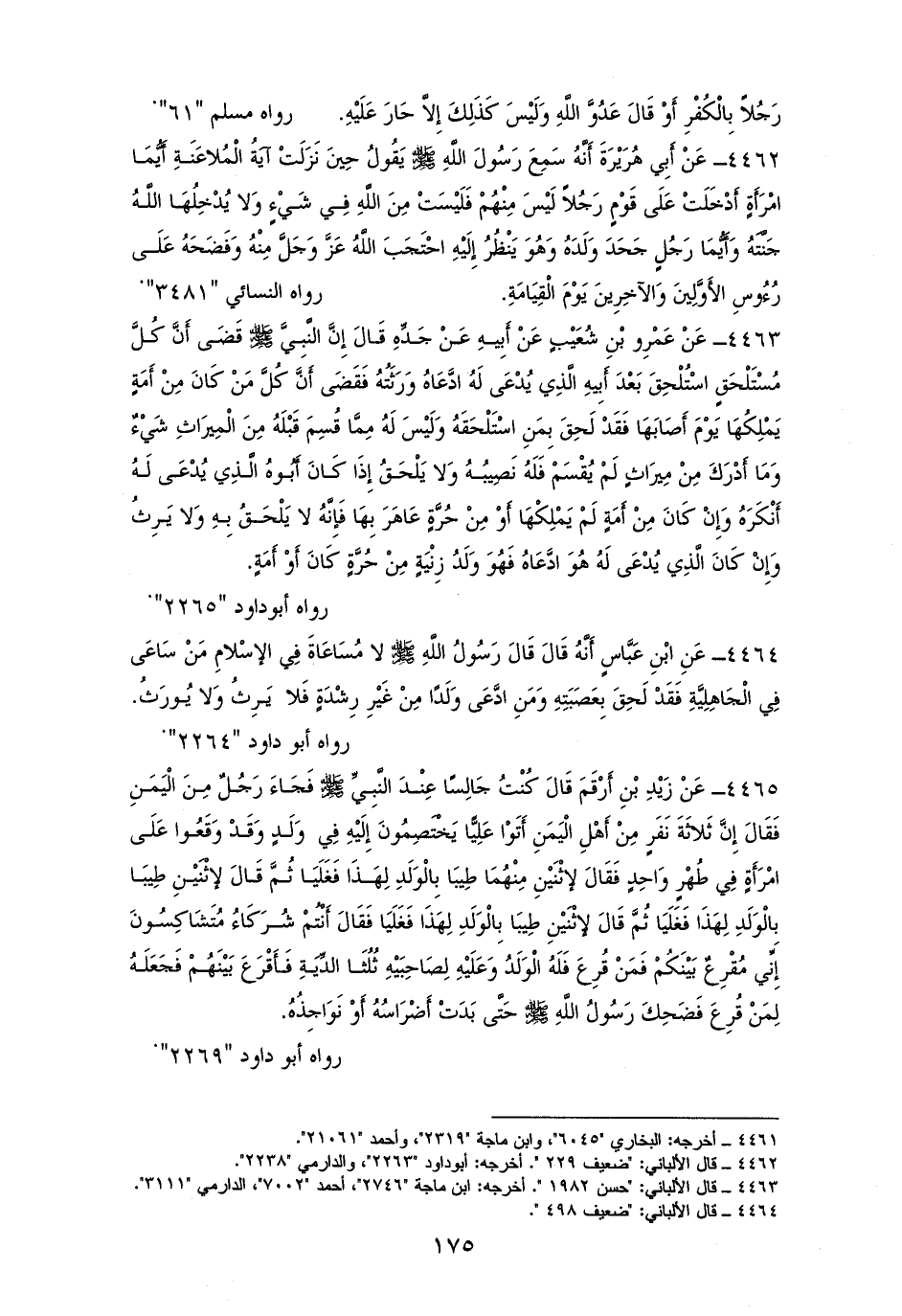 4463 - عَمْرُو بْنُ شُعَيْبٍ عَنْ أَبِيهِ عَنْ جَدِّهِ: أِنَّ النَّبِيَّ - صلى الله عليه وسلم - قَضَى أَنَّ كُلَّ مُسْتَلْحَقٍ اسْتُلْحِقَ بَعْدَ أَبِيهِ الَّذِي يُدْعَى لَهُ ادَّعَاهُ وَرَثَتُهُ، فَقَضَى أَنَّ كُلَّ مَنْ كَانَ مِنْ أَمَةٍ يَمْلِكُهَا يَوْمَ أَصَابَهَا فَقَدْ لَحِقَ بِمَنِ اسْتَلْحَقَهُ، وَلَيْسَ لَهُ مِمَّا قُسِمَ قَبْلَهُ مِنَ الْمِيرَاثِ شَيْءٌ وَمَا أَدْرَكَ مِنْ مِيرَاثٍ لَمْ يُقْسَمْ فَلَهُ نَصِيبُهُ، وَلا يَلْحَقُ إِذَا كَانَ أَبُوهُ الَّذِي يُدْعَى لَهُ أَنْكَرَهُ، فإِنْ كَانَ مِنْ أَمَةٍ لَمْ يَمْلِكْهَا أَوْ مِنْ حُرَّةٍ عَاهَرَ بِهَا فَإِنَّهُ لا يَلْحَقُ بِهِ وَلا يَرِثُ، وَإِنْ كَانَ الَّذِي يُدْعَى لَهُ هُوَ ادَّعَاهُ فَهُوَ وَلَدُ زِنْيَةٍ مِنْ حُرَّةٍ كَانَ أَوْ أَمَةٍ (¬1).