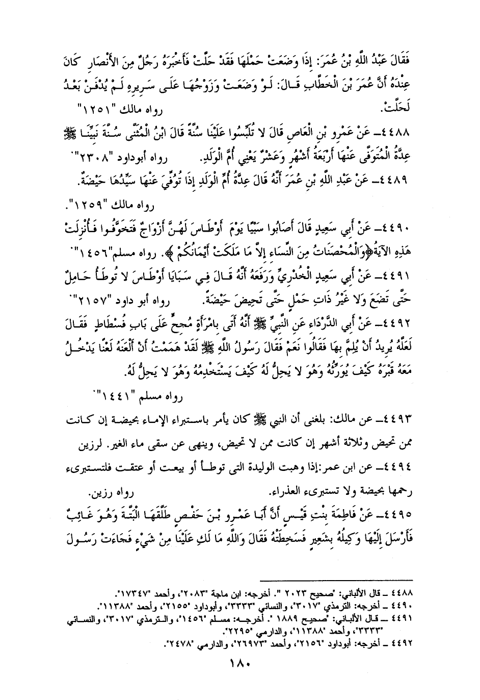 4489 - ولمالك عن ابْنِ عُمَرَ: عِدَّةُ أُمِّ الْوَلَدِ إِذَا تُوُفِّيَ عَنْهَا سَيِّدُهَا حَيْضَةٌ (¬1).