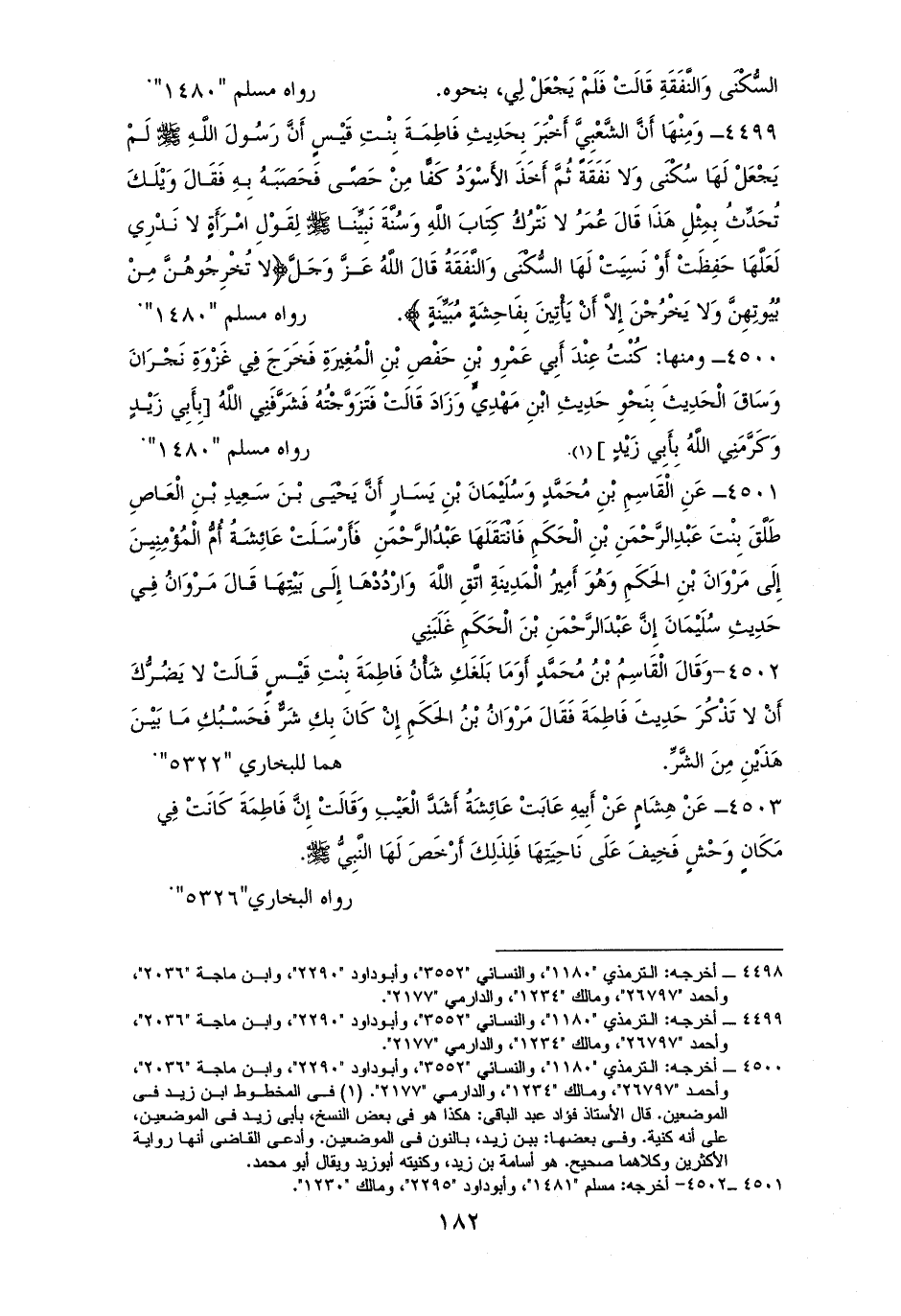 4499 - وَمِنْهَا: أَنَّ الشَّعْبِيَّ حدث بِحَدِيثِ فَاطِمَةَ بِنْتِ قَيْسٍ: لا سُكْنَى وَلا نَفَقَةً فأَخَذَ الأَسْوَدُ بن يزيد كَفًّا مِنْ حَصًى فَحَصَبَهُ بِهِ، قَالَ وَيْلَكَ تُحَدِّثُ بِمِثْلِ هَذَا. قَالَ عُمَرُ: لا نَتْرُكُ كِتَابَ الله وَسُنَّةَ نَبِيِّنَا لِقَوْلِ امْرَأَةٍ لا نَدْرِي أحَفِظَتْ أم نَسِيَتْ، لَهَا السُّكْنَى وَالنَّفَقَةُ قَالَ تعالى: {لا تُخْرِجُوهُنَّ مِنْ بُيُوتِهِنَّ وَلا يَخْرُجْنَ} الآية (¬1).