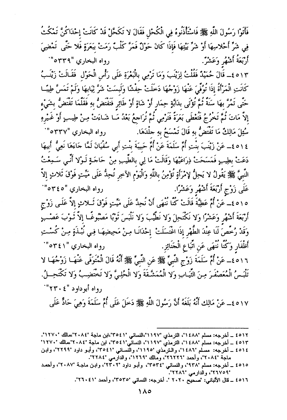 4516 - أُمُّ سَلَمَةَ رفعته: ((لا تَلْبَسُ الْمُتَوَفَّى عَنْهَا زَوْجُهَا الْمُعَصْفَرَ مِنَ الثِّيَابِ، وَلا الْمُمَشَّقَةَ، وَلا الْحُلِيَّ، وَلا تَخْتَضِبُ، وَلا تَكْتَحِلُ)). لأبي داود والنسائي (¬1).
