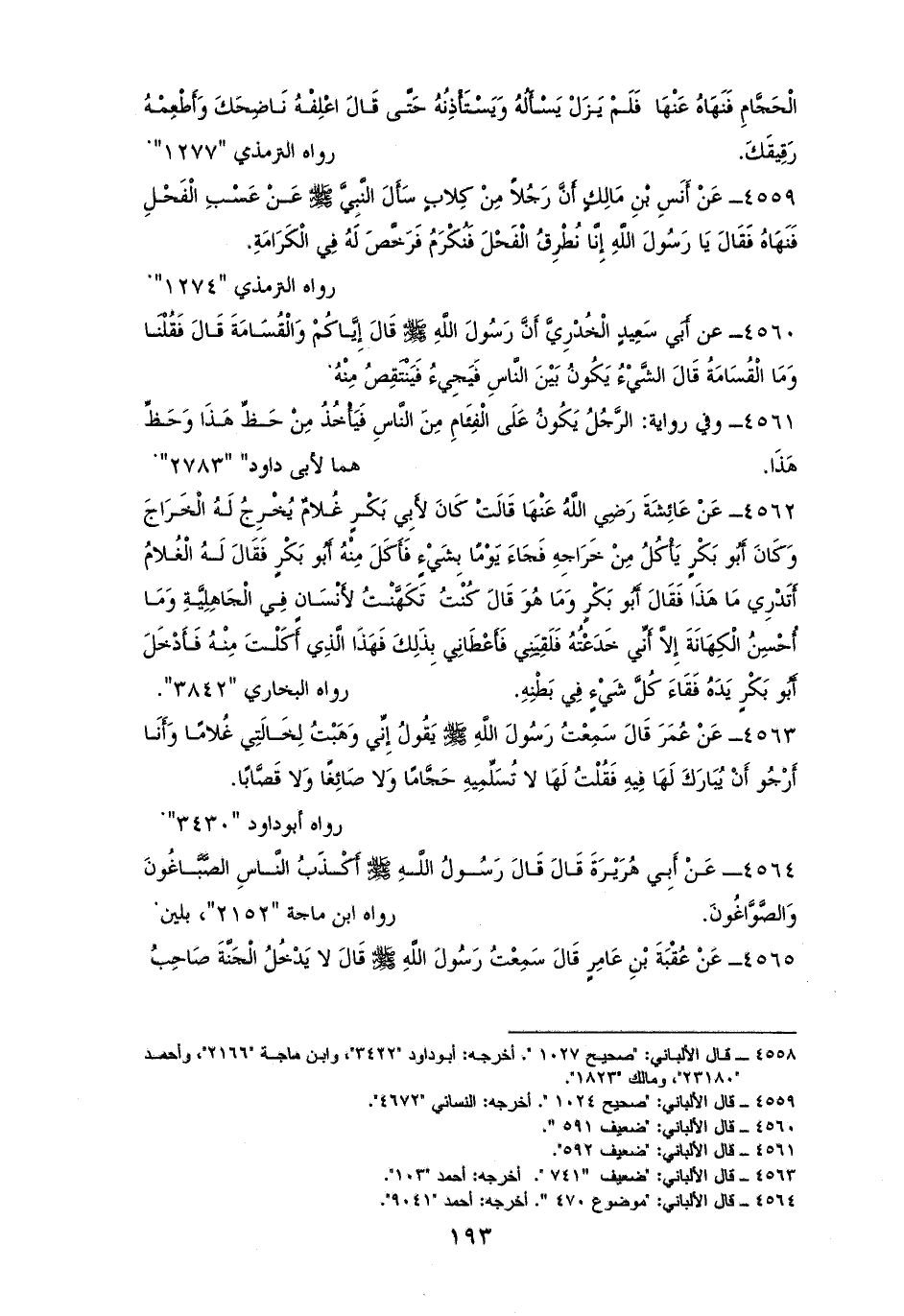 4563 - عُمَرُ رفعه: ((إِنِّي وَهَبْتُ لِخَالَتِي غُلامًا وَأَنَا أَرْجُو أَنْ يُبَارَكَ لَهَا فِيهِ فَقُلْتُ لَهَا لا تُسَلِّمِيهِ حَجَّامًا وَلا صَائِغًا وَلا قَصَّابًا)) (¬1).