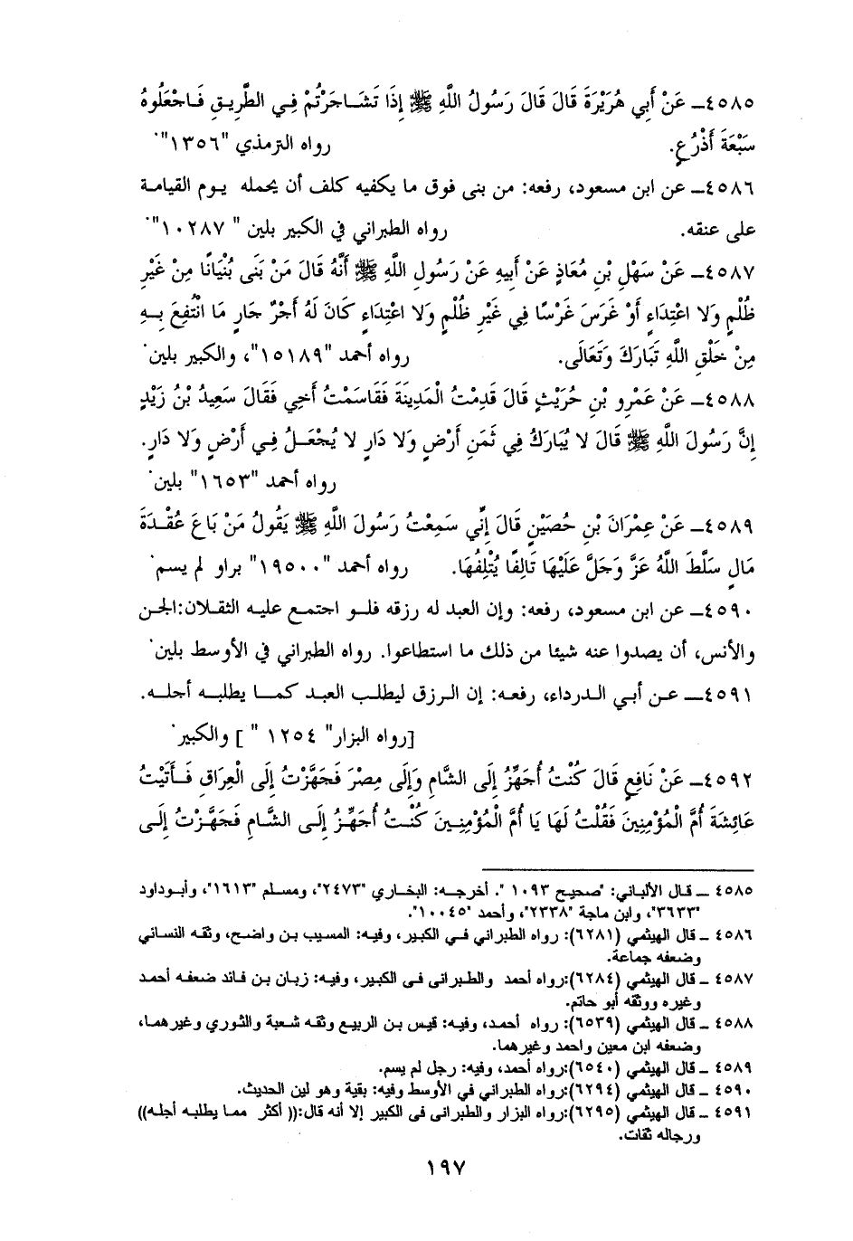 4585 - ابنُ مسعود رفعه: ((إِذَا تَشَاجَرْتُمْ فِي الطَّرِيقِ فَاجْعَلُوهُ سَبْعَةَ أَذْرُعٍ)). للشيخين وأبو داود والترمذي (¬1).
