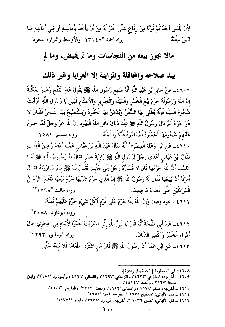 4609 - جَابِرُ: سَمِعَت النبي - صلى الله عليه وسلم - يَقُولُ عَامَ الْفَتْحِ بِمَكَّةَ ((إِنَّ الله حَرَّمَ بَيْعَ الْخَمْرِ وَالْمَيْتَةِ وَالْخِنْزِيرِ وَالأَصْنَامِ)). فَقِيلَ: يَا رَسُولَ الله أَرَأَيْتَ شُحُومَ الْمَيْتَةِ؟ فَإِنَّها يُطْلَى بِهَا السُّفُنُ وَيُدْهَنُ بِهَا الْجُلُودُ وَيَسْتَصْبِحُ بِهَا النَّاسُ. فَقَالَ: ((هُوَ حَرَامٌ، قَاتَلَ الله الْيَهُودَ، إِنَّ الله لَمَّا حَرَّمَ عَلَيْهِمْ شُحُومَهَا أَجْمَلُوهُ ثُمَّ بَاعُوهُ فَأَكَلُوا ثَمَنَهُ)). للستة إلا مالكًا (¬1).