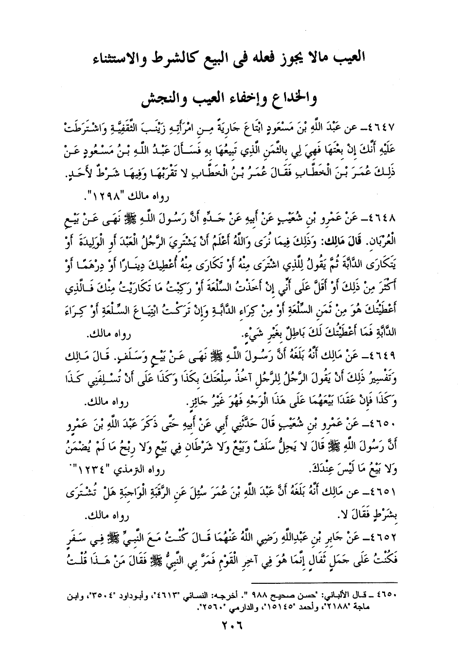 4650 - ابْنُ عَمْرٍو بن العاص رفعه: ((لا يَحِلُّ سَلَفٌ وَبَيْعٌ، وَلا شَرْطَانِ فِي بَيْعٍ، وَلا رِبْحُ مَا لَمْ يُضْمَنُ، وَلا بَيْعُ مَا لَيْسَ عِنْدَكَ)). لأصحاب السنن (¬1).