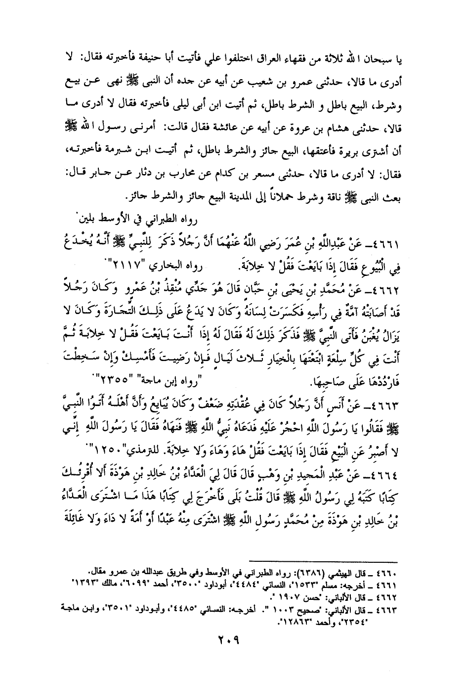 4661 - ابْنُ عُمَرَ: أَنَّ رَجُلاً ذَكَرَ لِلنَّبِيِّ - صلى الله عليه وسلم - أَنَّهُ يُخْدَعُ فِي البيع، فَقَالَ له: ((من بايعت فَقُلْ لا خِلابَةَ)) فكان إذا بايع قال: لا خلابة. للستة إلا الترمذي (¬1).