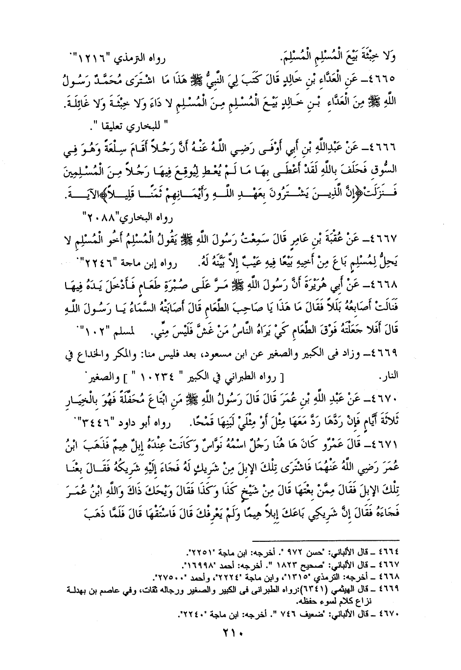4665 - وللبخاري: كَتَبَ لِيَ النَّبِيُّ - صلى الله عليه وسلم -: ((هَذَا مَا اشْتَرَى مُحَمَّدٌ رَسُولُ الله - صلى الله عليه وسلم - مِنَ الْعَدَّاءِ بْنِ خَالِدٍ، بَيْعَ الْمُسْلِمِ الْمُسْلِم، لا دَاءَ وَلا خبْثَةَ وَلا غَائِلَةَ)) (¬1).