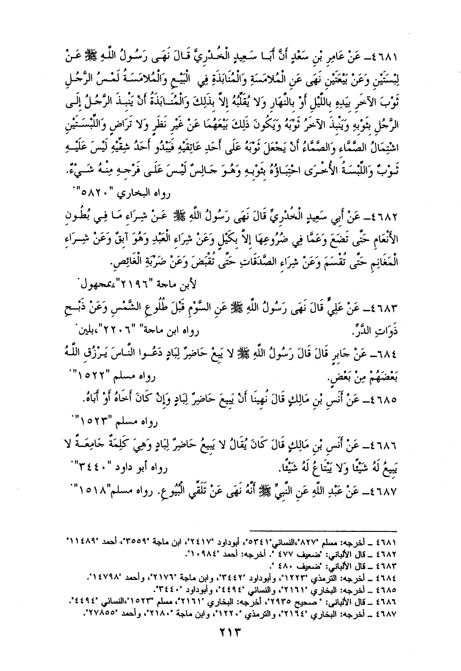 4684 - جَابِرُ رفعه: ((لا يَبِعْ حَاضِرٌ لِبَادٍ، ودَعُوا النَّاسَ يَرْزُقِ الله بَعْضَهُمْ مِنْ بَعْضٍ)). لمسلمٍ وأصحابِ السننِ (¬1).