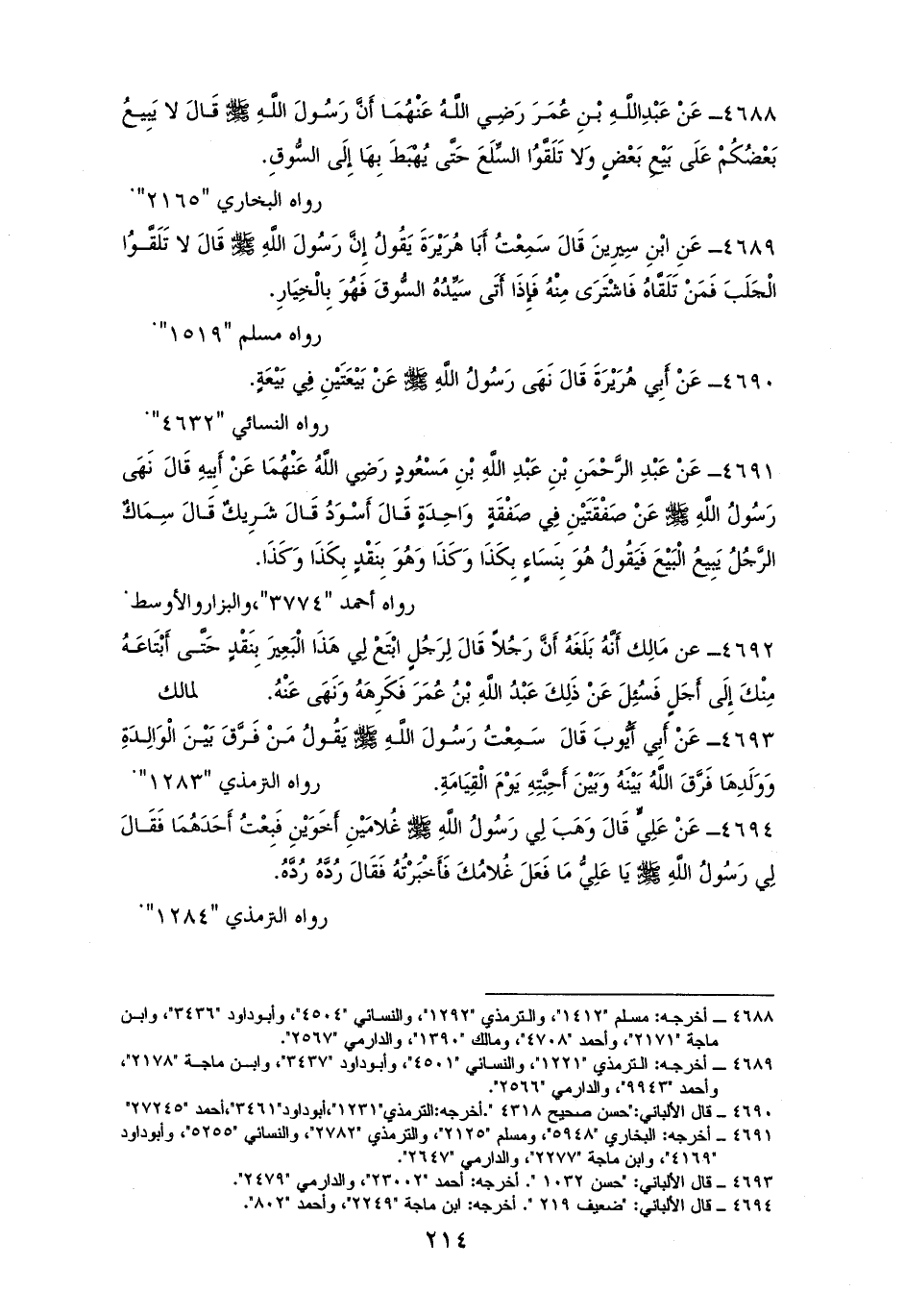 4689 - أبو هريرة: نهى النبيُّ - صلى الله عليه وسلم - أن يُتلقَّى الجلبُ، فمن تلقَّى فاشتراها منه، فإذا أتى سيده السوق فهو بالخيار. للستة إلا مالكًا (¬1).