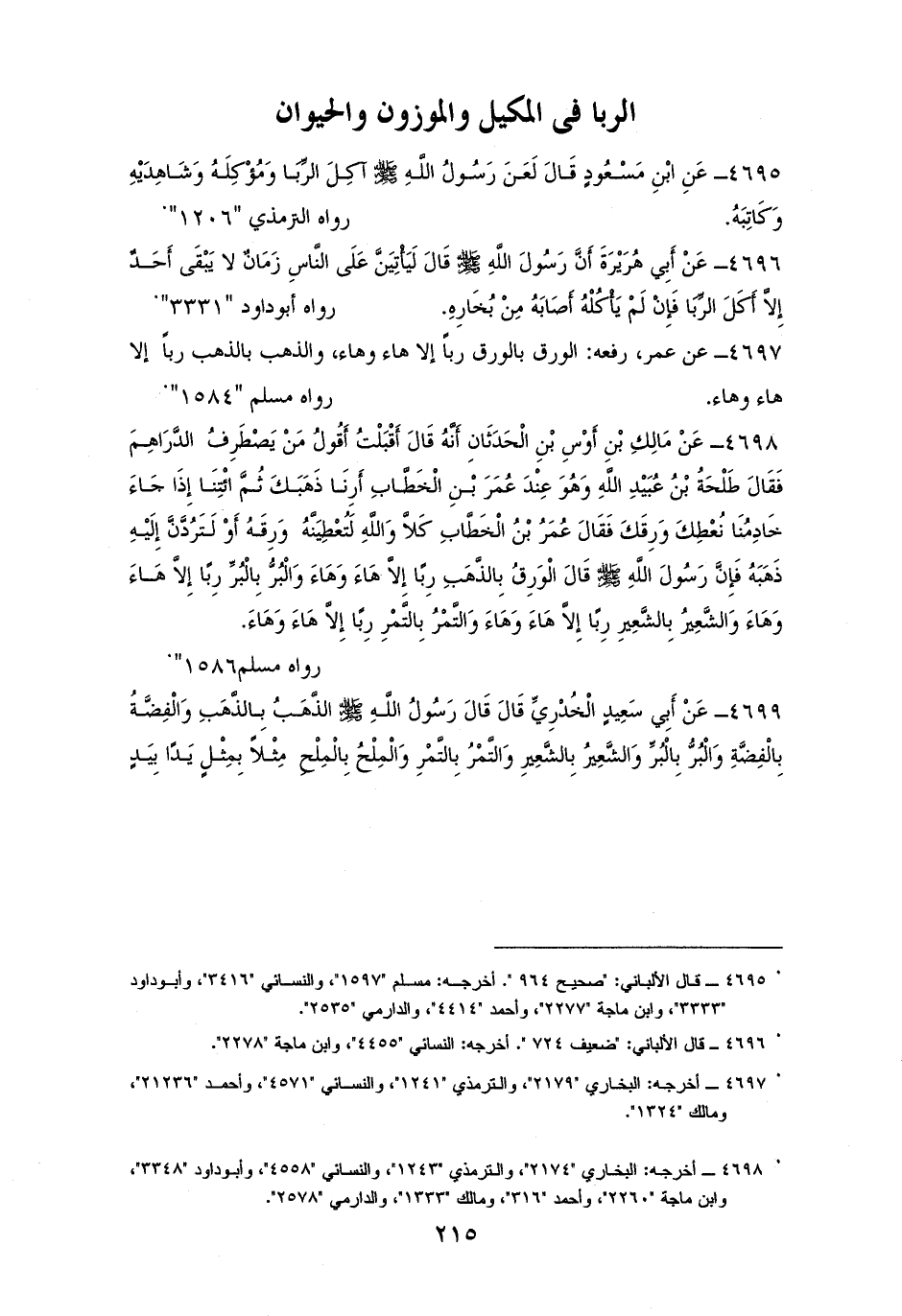 4695 - ابْنُ مَسْعُودٍ: لَعَنَ النبيُّ - صلى الله عليه وسلم - آكِلَ الرِّبَا وَمُؤْكِلَهُ وَشَاهِدَيْهِ وَكَاتِبَهُ. لمسلمٍ ,وأبي داودَ ,والترمذيِّ بلفظهما (¬1).