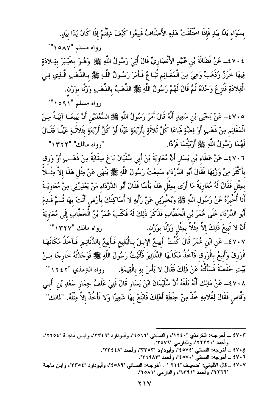 4704 - فَضَالَةُ بْنُ عُبَيْدٍ: أُتِيَ النبيُّ - صلى الله عليه وسلم - وَهُوَ بِخَيْبَرَ بِقِلادَةٍ فِيهَا خَرَزٌ وَذَهَبٌ، وَهِيَ مِنَ الْمَغَانِمِ تُبَاعُ، فَأَمَرَ بِالذَّهَبِ الَّذِي فِي الْقِلادَةِ فَنُزِعَ وَحْدَهُ، ثُمَّ قَالَ: ((الذَّهَبُ بِالذَّهَبِ وَزْنًا بِوَزْنٍ)). هما لمسلم وأصحابِ السننِ (¬1).