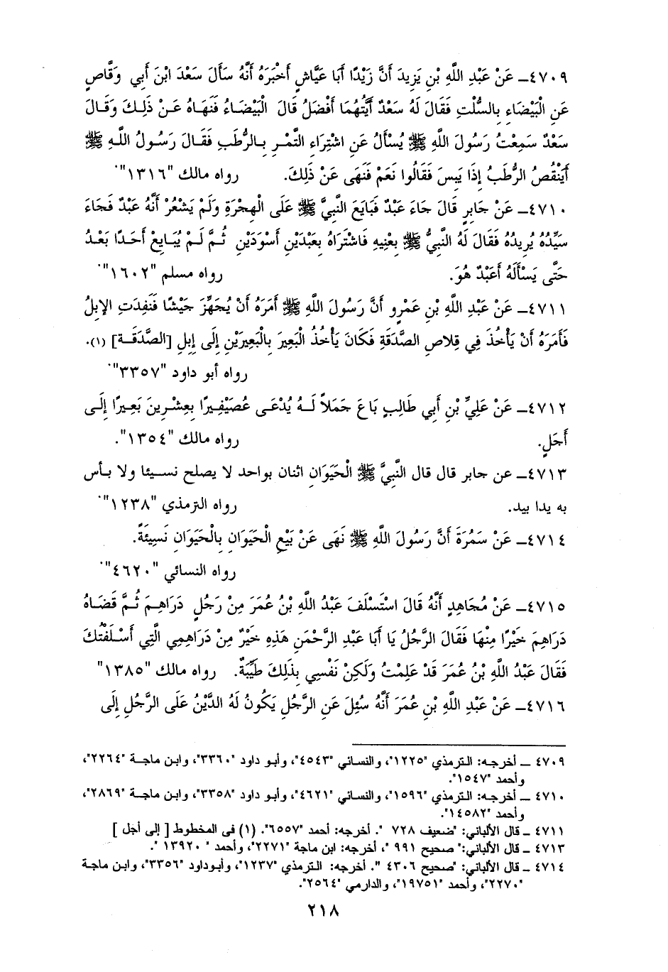 4712 - عَلِيٌّ: بَاعَ جَمَلاً لَهُ يُدْعَى عُصَيْفِير بِعِشْرِينَ بَعِيرًا إِلَى أَجَلٍ. لمالك (¬1).