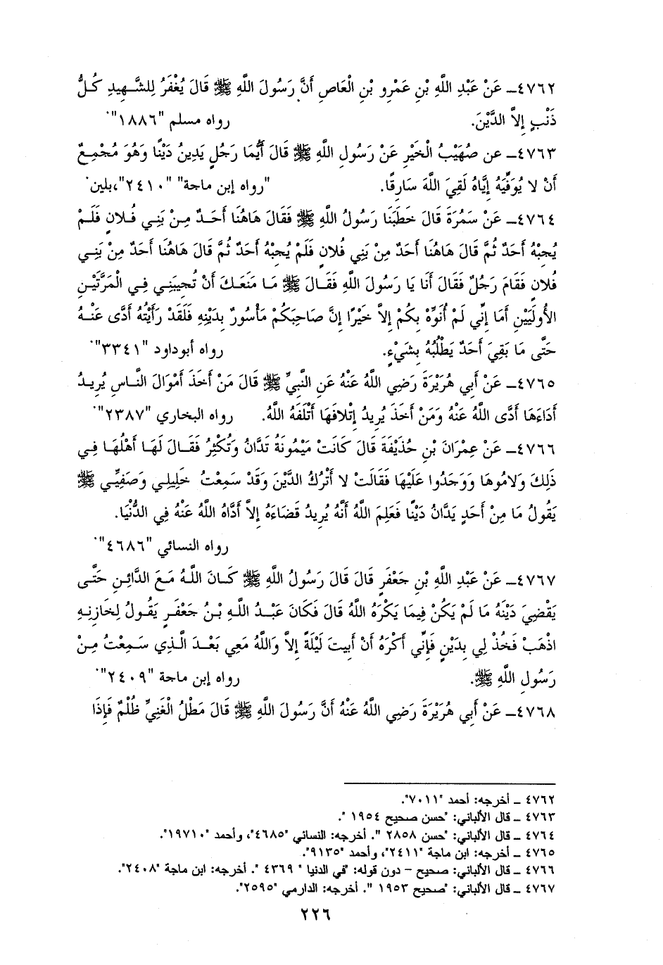 4762 - ابْنُ عَمْرِو بْنِ الْعَاصِ رفعه: يُغْفَرُ لِلشَّهِيدِ كُلُّ ذَنْبٍ إِلاَّ الدَّيْنَ. لمسلم (¬1).